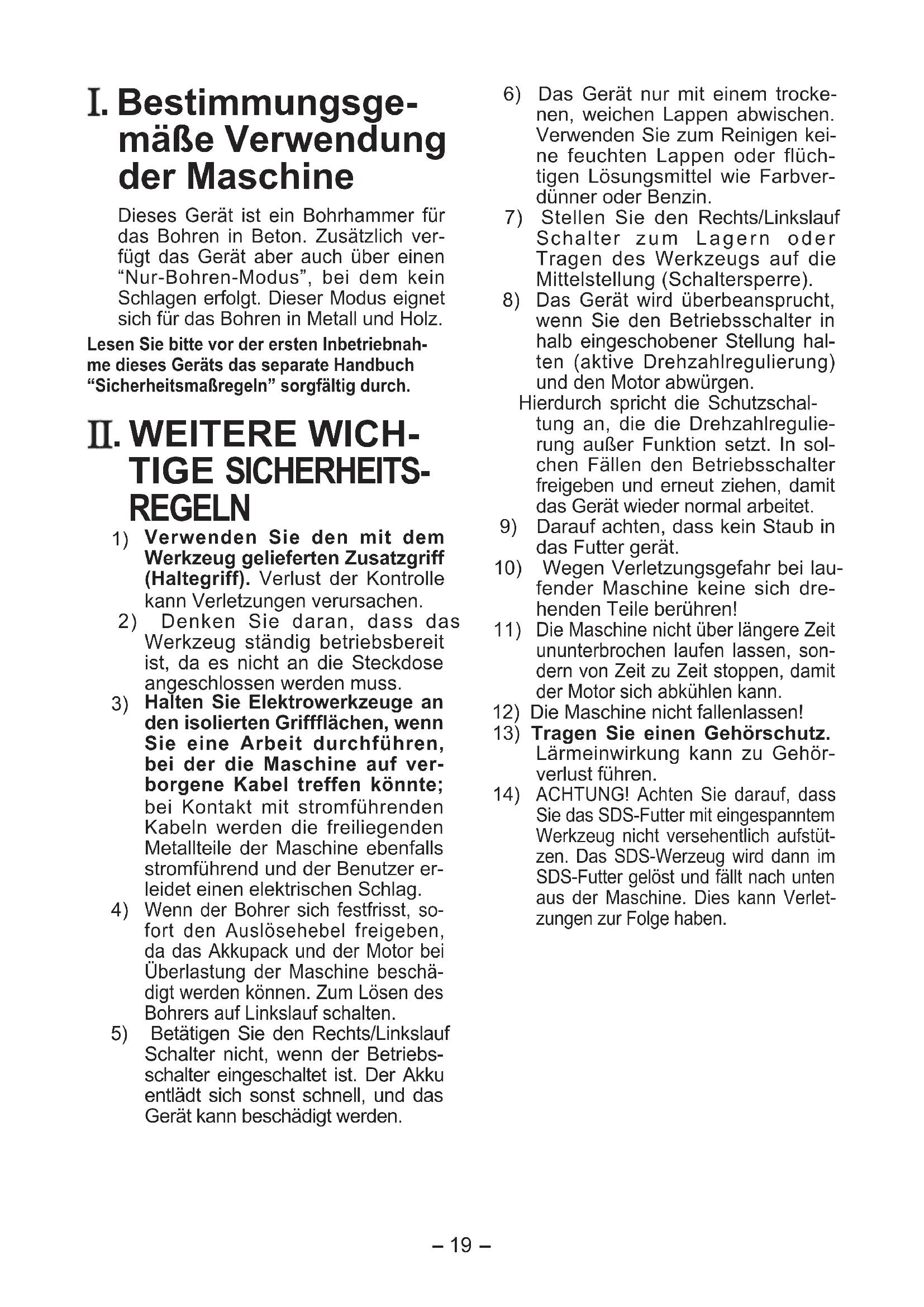 . Bestimmungsge- mäße Verwendung der Maschine Dieses Gerät ist ein Bohrhammer für das Bohren in Beton. Zusätzlich ver- fügt das Gerät aber auch über einen “Nur-Bohren-Modus”, bei dem kein Schlagen erfolgt. Dieser Modus eignet sich für das Bohren in Metall und Holz. Lesen Sie bitte vor der ersten Inbetriebnah- me dieses Geräts das separate Handbuch “Sicherheitsmaßregeln” sorgfältig durch. . WEITERE WICH- TIGE SICHERHEITS- REGELN