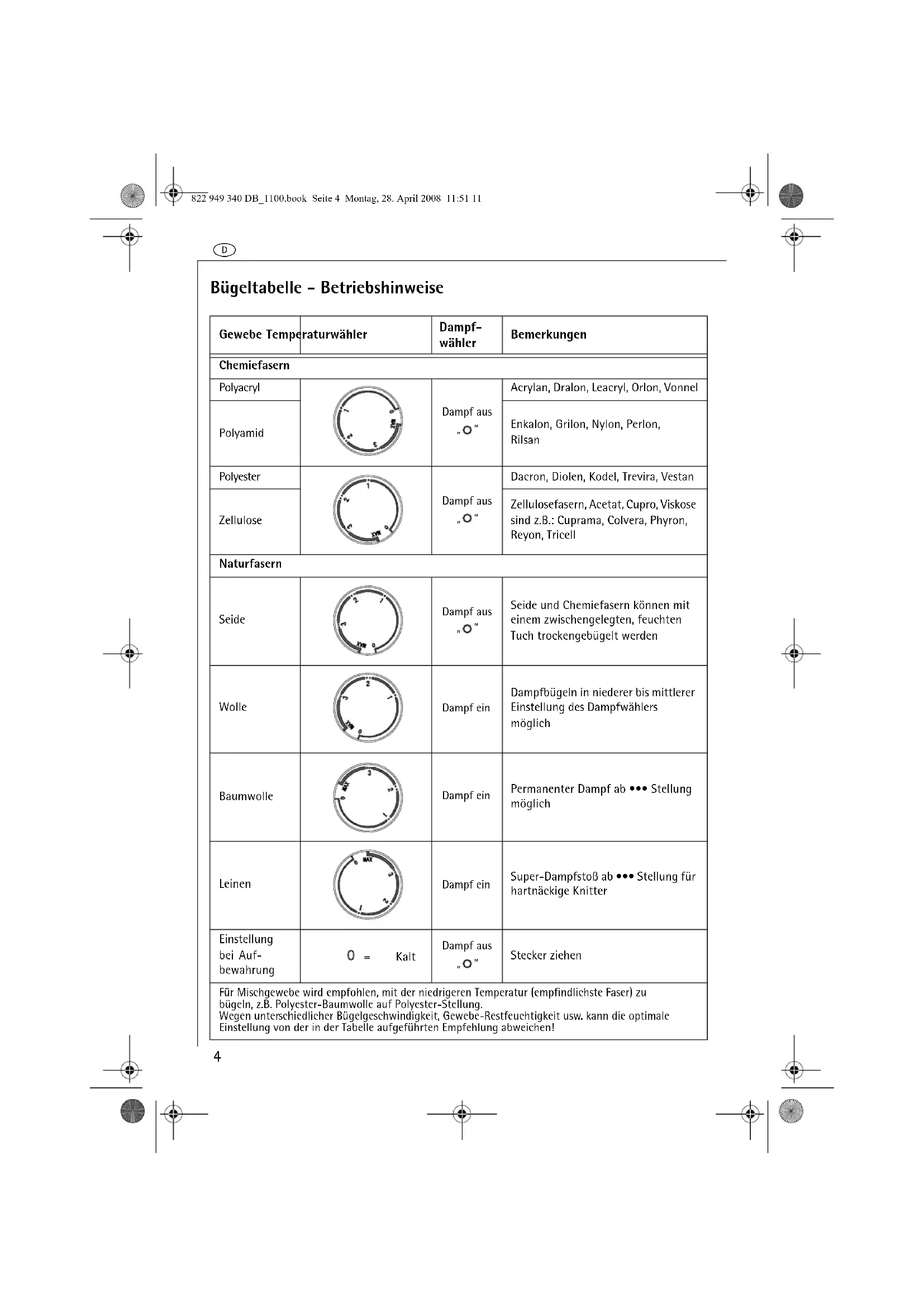 | Für Mischgewebe wird empfohlen, mit der niedrigeren Temperatur (empfindlichste Faser) zu bügeln, z.B. Polyester-Baumwolle auf Polyester-Stellung.Wegen unterschiedlicher Bügelgeschwindigkeit, Gewebe-Restfeuchtigkeit usw. kann die optimale Einstellung von der in der Tabelle aufgeführten Empfehlung abweichen! | |||