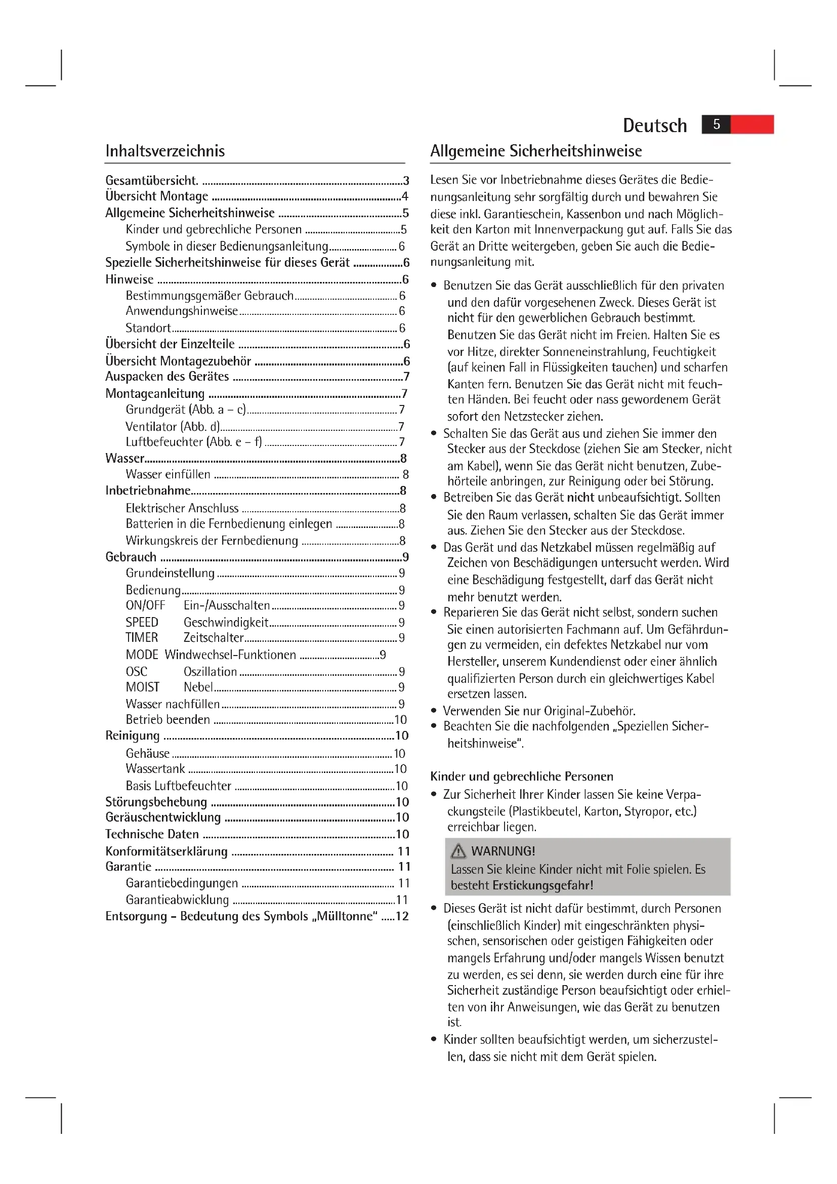 - Kinder sollten beaufsichtigt werden, um sicherzustel- len, dass sie nicht mit dem Gerät spielen. Inhaltsverzeichnis Gesamtübersicht. .........................................................................3 Übersicht Montage .....................................................................4 Allgemeine Sicherheitshinweise .............................................5 Kinder und gebrechliche Personen ......................................5 Symbole in dieser Bedienungsanleitung ........................... 6 Spezielle Sicherheitshinweise für dieses Gerät ..................6 Hinweise .........................................................................................6 Bestimmungsgemäßer Gebrauch .........................................6 Anwendungshinweise ...............................................................6 Standort ..........................................................................................6 Übersicht der Einzelteile ............................................................6 Übersicht Montagezubehör ......................................................6 Auspacken des Gerätes ..............................................................7 Montageanleitung ......................................................................7 Grundgerät (Abb. a – c) ............................................................7 Ventilator (Abb. d).......................................................................7 Luftbefeuchter (Abb. e – f) .....................................................7 Wasser.............................................................................................8 Wasser einfüllen .......................................................................... 8 Inbetriebnahme............................................................................8 Elektrischer Anschluss ...............................................................8 Batterien in die Fernbedienung einlegen .........................8 Wirkungskreis der Fernbedienung .......................................8 Gebrauch ........................................................................................9 Grundeinstellung ........................................................................9 Bedienung ......................................................................................9 ON/OFF Ein-/Ausschalten ..................................................9 SPEED Geschwindigkeit ...................................................9 TIMER Zeitschalter .............................................................9 MODE Windwechsel-Funktionen ................................9 OSC Oszillation ...............................................................9 MOIST Nebel ......................................................................... 9 Wasser nachfüllen ...................................................................... 9 Betrieb beenden ........................................................................10 Reinigung ....................................................................................10 Gehäuse ........................................................................................10 Wassertank ..................................................................................10 Basis Luftbefeuchter ................................................................10 Störungsbehebung ...................................................................10 Geräuschentwicklung ..............................................................10 Technische Daten ......................................................................10 Konformitätserklärung ........................................................... 11 Garantie ....................................................................................... 11 Garantiebedingungen ............................................................. 11 Garantieabwicklung .................................................................11 Entsorgung - Bedeutung des Symbols „Mülltonne“ .....126 Deutsch Symbole in dieser Bedienungsanleitung Wichtige Hinweise für Ihre Sicherheit sind besonders gekennzeichnet. Beachten Sie diese Hinweise unbedingt, um Unfälle und Schäden am Gerät zu vermeiden: WARNUNG: Warnt vor Gefahren für Ihre Gesundheit und zeigt mögliche Verletzungsrisiken auf. ACHTUNG: Weist auf mögliche Gefährdungen für das Gerät oder andere Gegenstände hin. HINWEIS: Hebt Tipps und Informationen für Sie hervor. Spezielle Sicherheitshinweise für dieses Gerät