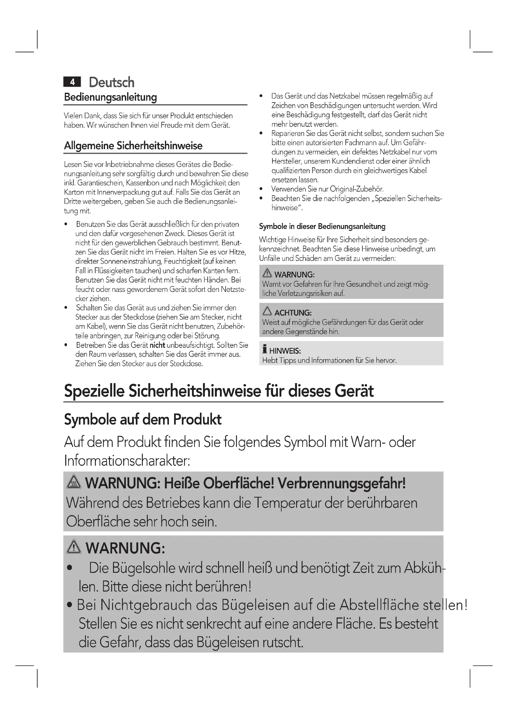 - DieBügelsohlewirdschnellheißundbenötigtZeitzumAbküh- len. Bitte diese nicht berühren!
