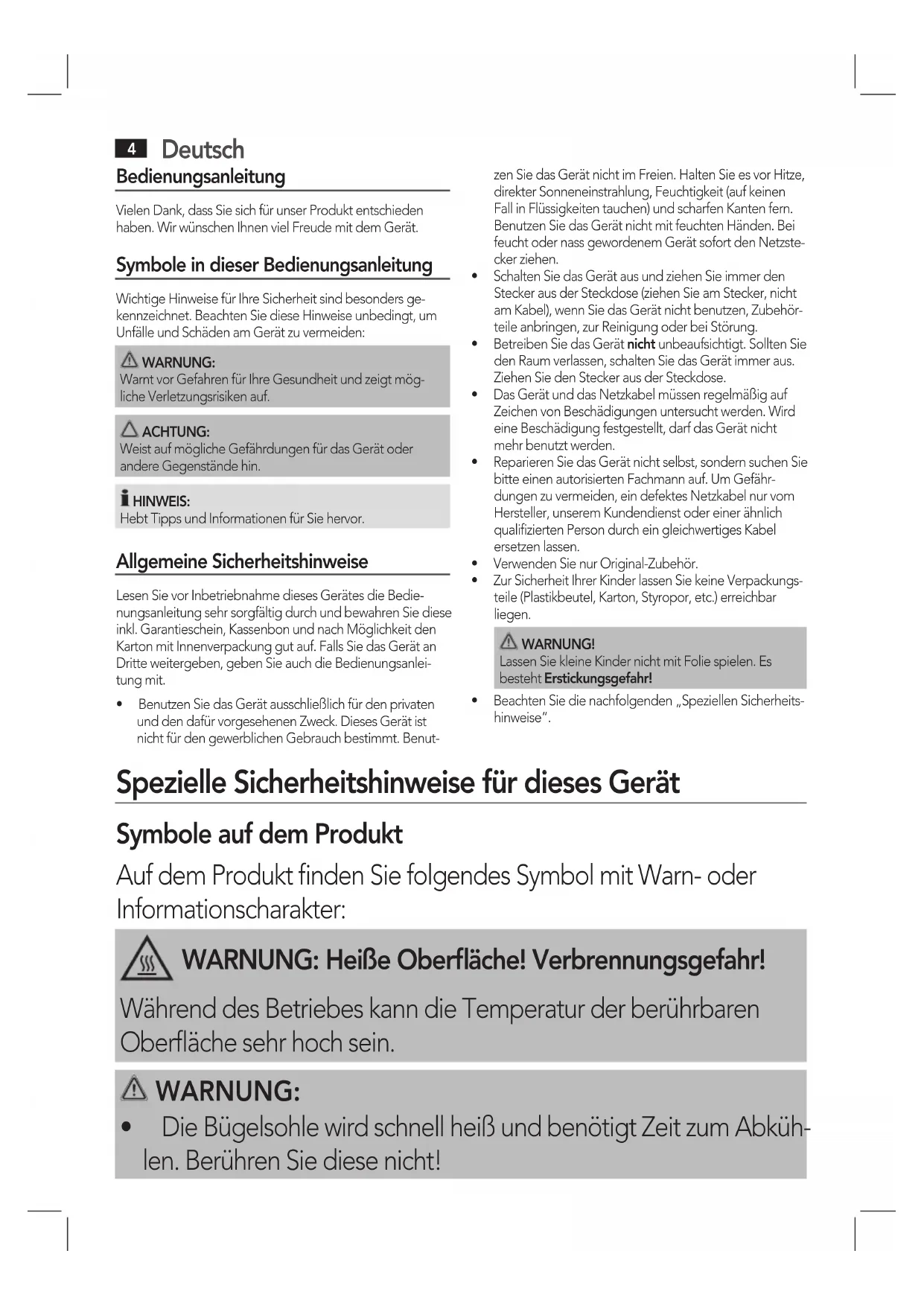 Bedienungsanleitung Vielen Dank, dass Sie sich für unser Produkt entschieden haben. Wir wünschen Ihnen viel Freude mit dem Gerät. Symbole in dieser Bedienungsanleitung Wichtige Hinweise für Ihre Sicherheit sind besonders ge-kennzeichnet. Beachten Sie diese Hinweise unbedingt, um Unfälle und Schäden am Gerät zu vermeiden: WARNUNG: Warnt vor Gefahren für Ihre Gesundheit und zeigt mög-liche Verletzungsrisiken auf. ACHTUNG: Weist auf mögliche Gefährdungen für das Gerät oder andere Gegenstände hin. HINWEIS: Hebt Tipps und Informationen für Sie hervor. Allgemeine Sicherheitshinweise Lesen Sie vor Inbetriebnahme dieses Gerätes die Bedie-nungsanleitung sehr sorgfältig durch und bewahren Sie diese inkl. Garantieschein, Kassenbon und nach Möglichkeit den Karton mit Innenverpackung gut auf. Falls Sie das Gerät an Dritte weitergeben, geben Sie auch die Bedienungsanlei-tung mit.• BenutzenSiedasGerätausschließlichfürdenprivatenund den dafür vorgesehenen Zweck. Dieses Gerät ist nicht für den gewerblichen Gebrauch bestimmt. Benut-zen Sie das Gerät nicht im Freien. Halten Sie es vor Hitze, direkter Sonneneinstrahlung, Feuchtigkeit (auf keinen Fall in Flüssigkeiten tauchen) und scharfen Kanten fern. Benutzen Sie das Gerät nicht mit feuchten Händen. Bei feucht oder nass gewordenem Gerät sofort den Netzste-cker ziehen. • SchaltenSiedasGerätausundziehenSieimmerdenStecker aus der Steckdose (ziehen Sie am Stecker, nicht am Kabel), wenn Sie das Gerät nicht benutzen, Zubehör-teile anbringen, zur Reinigung oder bei Störung.• BetreibenSiedasGerätnicht unbeaufsichtigt. Sollten Sie den Raum verlassen, schalten Sie das Gerät immer aus. Ziehen Sie den Stecker aus der Steckdose.• DasGerätunddasNetzkabelmüssenregelmäßigaufZeichen von Beschädigungen untersucht werden. Wird eine Beschädigung festgestellt, darf das Gerät nicht mehr benutzt werden.• ReparierenSiedasGerätnichtselbst,sondernsuchenSiebitte einen autorisierten Fachmann auf. Um Gefähr-dungen zu vermeiden, ein defektes Netzkabel nur vom Hersteller, unserem Kundendienst oder einer ähnlich qualifizierten Person durch ein gleichwertiges Kabel ersetzen lassen.• VerwendenSienurOriginal-Zubehör.• ZurSicherheitIhrerKinderlassenSiekeineVerpackungs-teile (Plastikbeutel, Karton, Styropor, etc.) erreichbar liegen. WARNUNG! Lassen Sie kleine Kinder nicht mit Folie spielen. Es besteht Erstickungsgefahr!• BeachtenSiedienachfolgenden„SpeziellenSicherheits-hinweise“. Spezielle Sicherheitshinweise für dieses Gerät Symbole auf dem Produkt Auf dem Produkt finden Sie folgendes Symbol mit Warn- oder Informationscharakter: WARNUNG: Heiße Oberfläche! Verbrennungsgefahr! Während des Betriebes kann die Temperatur der berührbaren Oberfläche sehr hoch sein. WARNUNG: