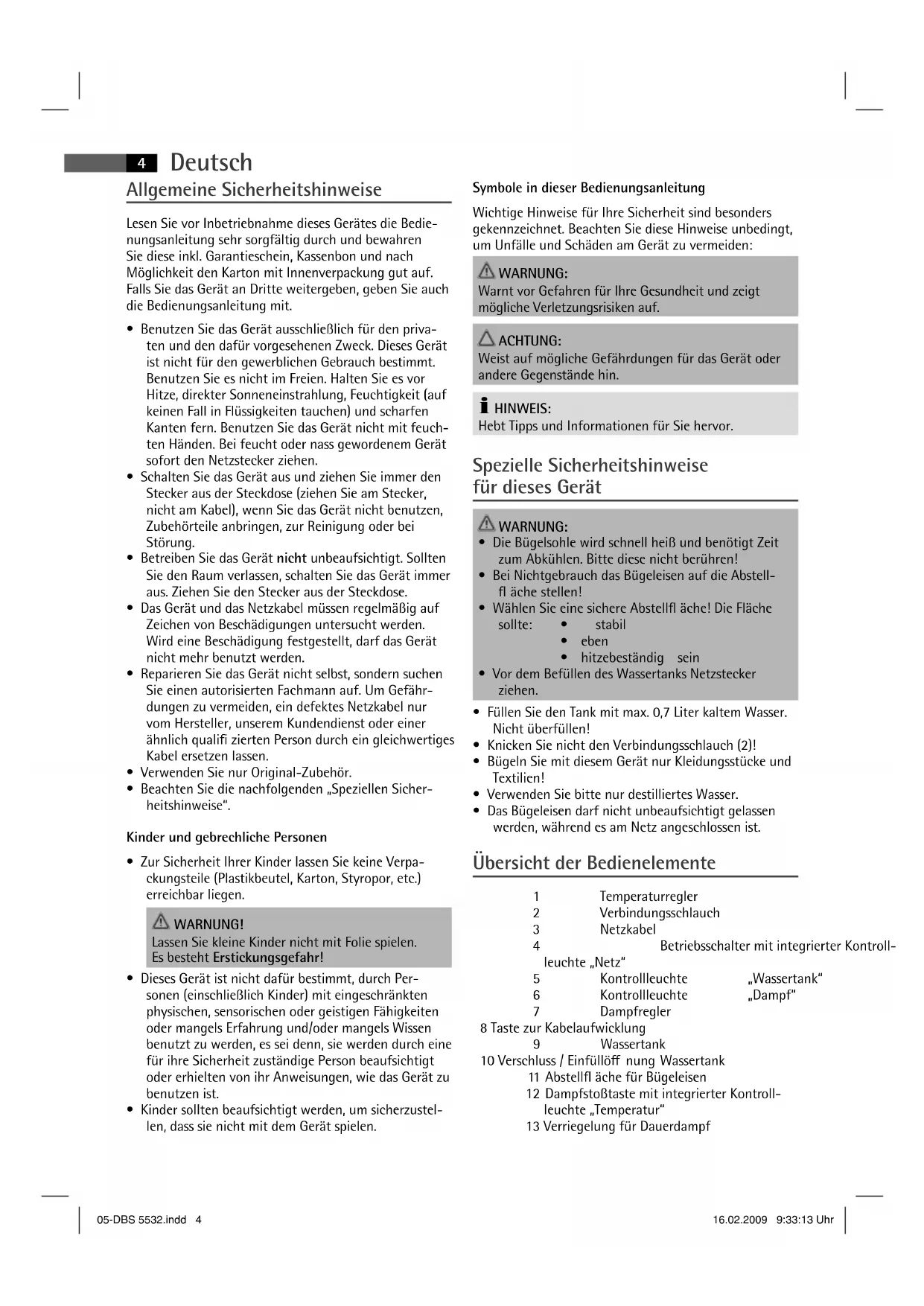 - Das Bügeleisen darf nicht unbeaufsichtigt gelassen werden, während es am Netz angeschlossen ist. Übersicht der Bedienelemente 1 Temperaturregler 2 Verbindungsschlauch 3 Netzkabel 4 Betriebsschalter mit integrierter Kontroll- leuchte „Netz“ 5 Kontrollleuchte „Wassertank“ 6 Kontrollleuchte „Dampf“ 7 Dampfregler 8 Taste zur Kabelaufwicklung 9 Wassertank 10 Verschluss / Einfüllö nung Wassertank 11 Abstell äche für Bügeleisen 12 Dampfstoßtaste mit integrierter Kontroll- leuchte „Temperatur“ 13 Verriegelung für Dauerdampf 05-DBS 5532.indd 405-DBS 5532.indd 4 16.02.2009 9:33:13 Uhr16.02.2009 9:33:13 UhrDeutsch
