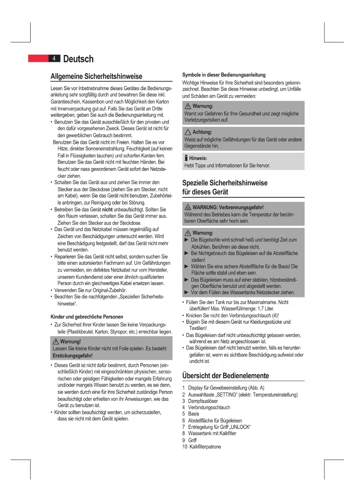 - Kinder sollten beaufsichtigt werden, um sicherzustellen, dass sie nicht mit dem Gerät spielen. Symbole in dieser Bedienungsanleitung Wichtige Hinweise für Ihre Sicherheit sind besonders gekenn- zeichnet. Beachten Sie diese Hinweise unbedingt, um Unfälle und Schäden am Gerät zu vermeiden: W arnung: Warnt vor Gefahren für Ihre Gesundheit und zeigt mögliche Verletzungsrisiken auf. Achtung: Weist auf mögliche Gefährdungen für das Gerät oder andere Gegenstände hin. Hinweis: Hebt Tipps und Informationen für Sie hervor. Spezielle Sicherheitshinweise für dieses Gerät WARNUNG: Verbrennungsgefahr! Während des Betriebes kann die Temperatur der berühr- baren Oberäche sehr hoch sein. W arnung: ► Die Bügelsohle wird schnell heiß und benötigt Zeit zum Abkühlen. Berühren sie diese nicht. ► Bei Nichtgebrauch das Bügeleisen auf die Abstelläche stellen! ► Wählen Sie eine sichere Abstelläche für die Basis! Die Fläche sollte stabil und eben sein. ► Das Bügeleisen muss auf einer stabilen, hitzebeständi- gen Oberäche benutzt und abgestellt werden. ► Vor dem Füllen des Wassertanks Netzstecker ziehen.