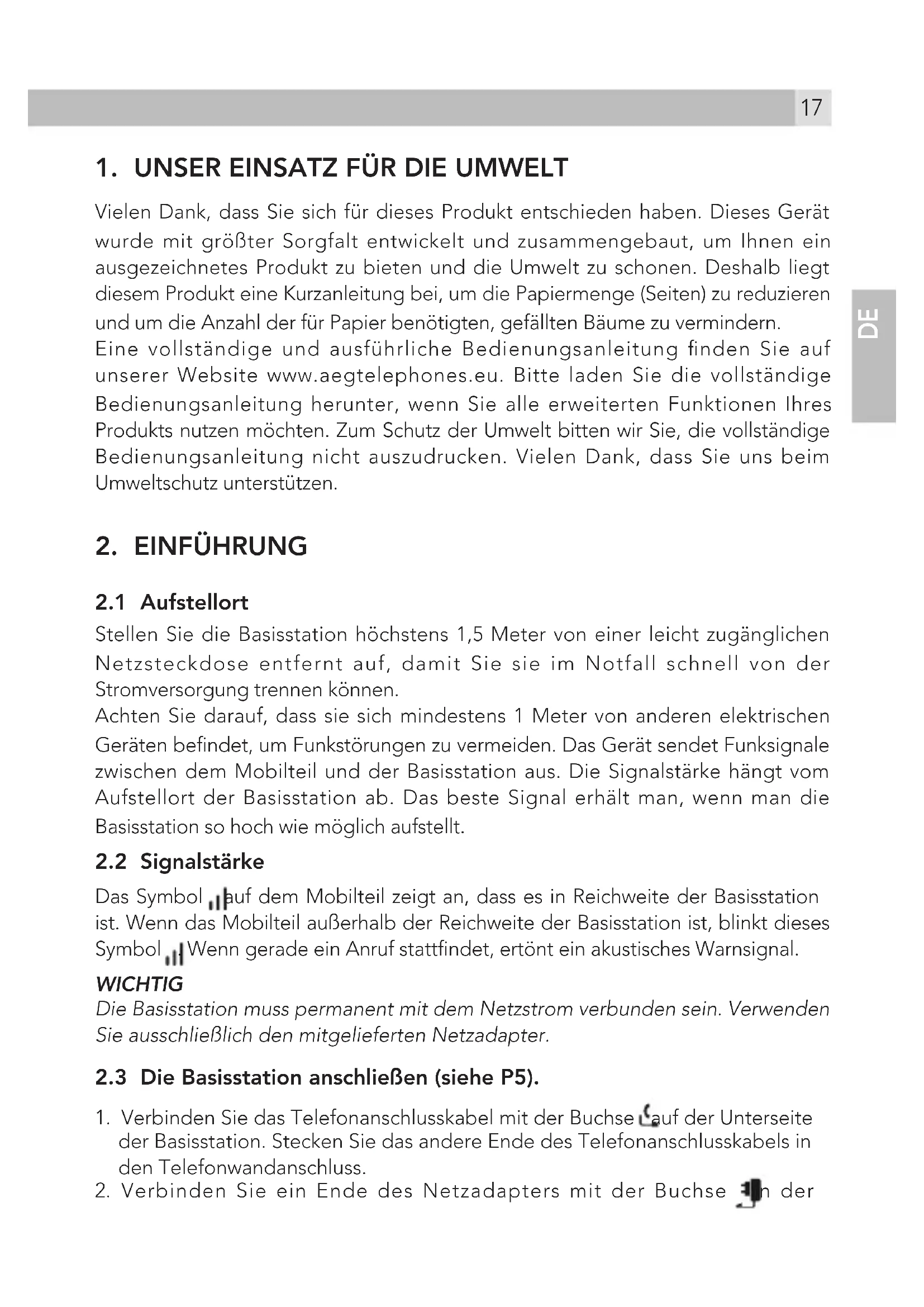 Vielen Dank, dass Sie sich für dieses Produkt entschieden haben. Dieses Gerät wurde mit größter Sorgfalt entwickelt und zusammengebaut, um Ihnen ein ausgezeichnetes Produkt zu bieten und die Umwelt zu schonen. Deshalb liegt diesem Produkt eine Kurzanleitung bei, um die Papiermenge (Seiten) zu reduzieren und um die Anzahl der für Papier benötigten, gefällten Bäume zu vermindern. Eine vollständige und ausführliche Bedienungsanleitung finden Sie auf unserer Website www.aegtelephones.eu. Bitte laden Sie die vollständige Bedienungsanleitung herunter, wenn Sie alle erweiterten Funktionen Ihres Produkts nutzen möchten. Zum Schutz der Umwelt bitten wir Sie, die vollständige Bedienungsanleitung nicht auszudrucken. Vielen Dank, dass Sie uns beim Umweltschutz unterstützen.