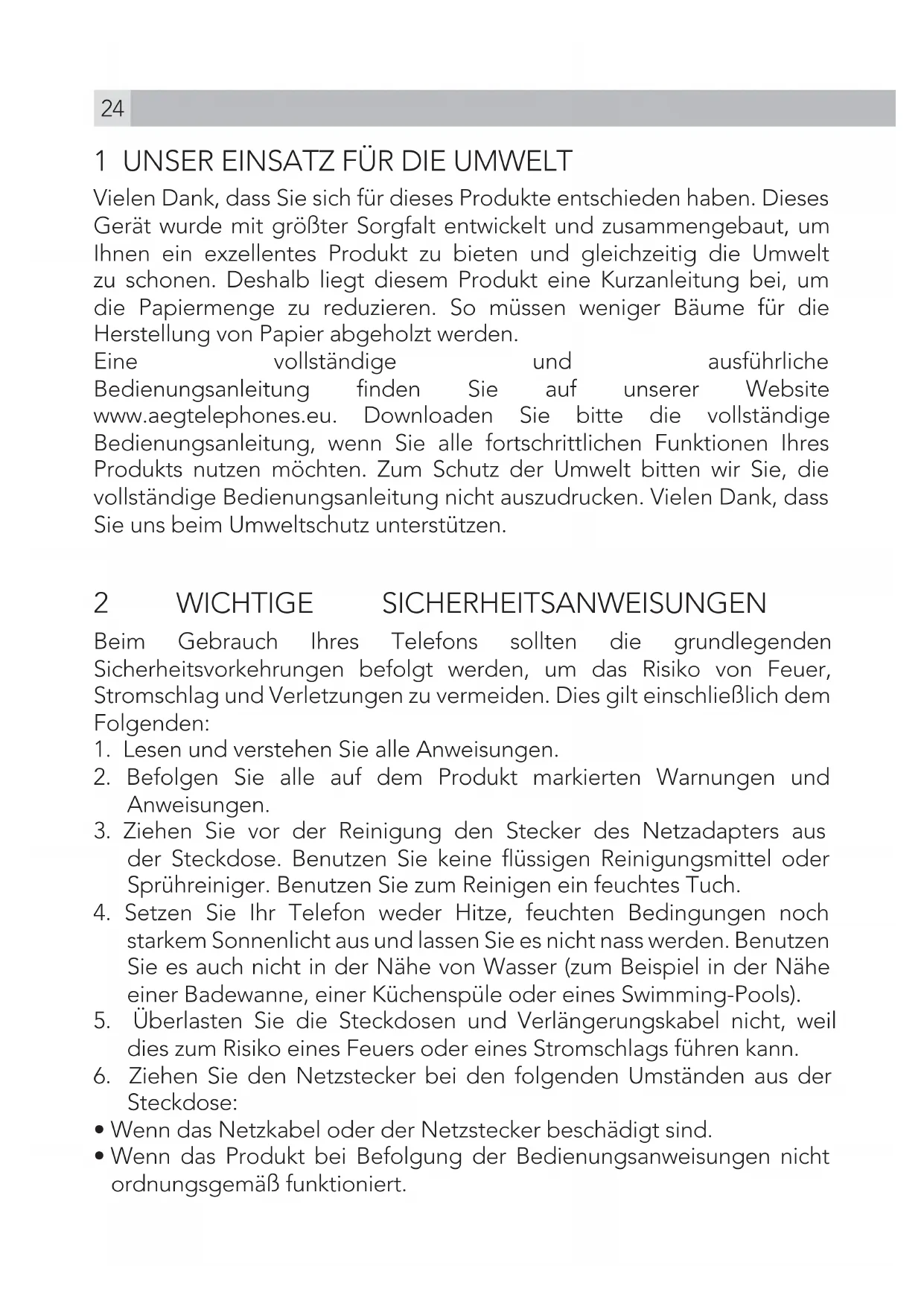 Vielen Dank, dass Sie sich für dieses Produkte entschieden haben. Dieses Gerät wurde mit größter Sorgfalt entwickelt und zusammengebaut, um Ihnen ein exzellentes Produkt zu bieten und gleichzeitig die Umwelt zu schonen. Deshalb liegt diesem Produkt eine Kurzanleitung bei, um die Papiermenge zu reduzieren. So müssen weniger Bäume für die Herstellung von Papier abgeholzt werden. Eine vollständige und ausführliche Bedienungsanleitung finden Sie auf unserer Website www.aegtelephones.eu. Downloaden Sie bitte die vollständige Bedienungsanleitung, wenn Sie alle fortschrittlichen Funktionen Ihres Produkts nutzen möchten. Zum Schutz der Umwelt bitten wir Sie, die vollständige Bedienungsanleitung nicht auszudrucken. Vielen Dank, dass Sie uns beim Umweltschutz unterstützen. 2 WICHTIGE SICHERHEITSANWEISUNGEN Beim Gebrauch Ihres Telefons sollten die grundlegenden Sicherheitsvorkehrungen befolgt werden, um das Risiko von Feuer, Stromschlag und Verletzungen zu vermeiden. Dies gilt einschließlich dem Folgenden: