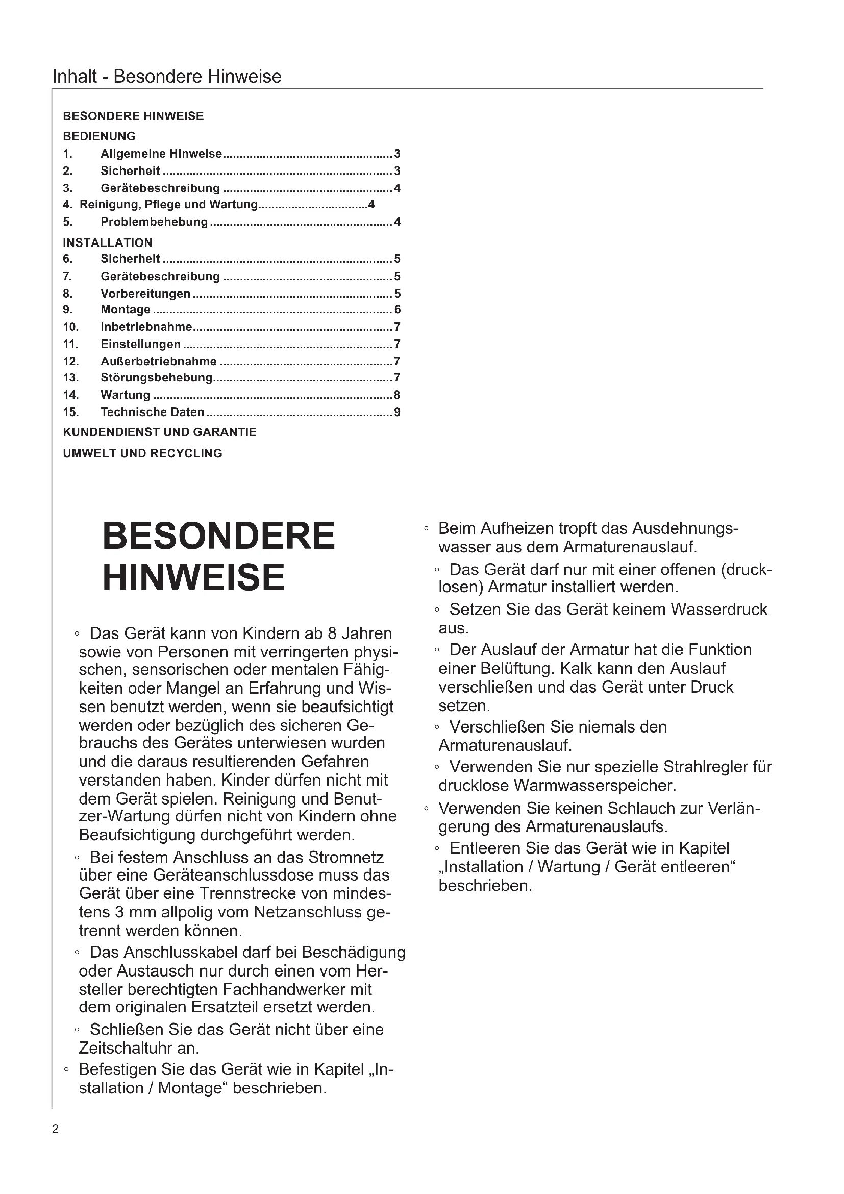 SachschadenDas Gerät und die Armatur sind vom Nutzer vor Frost zu schützen.