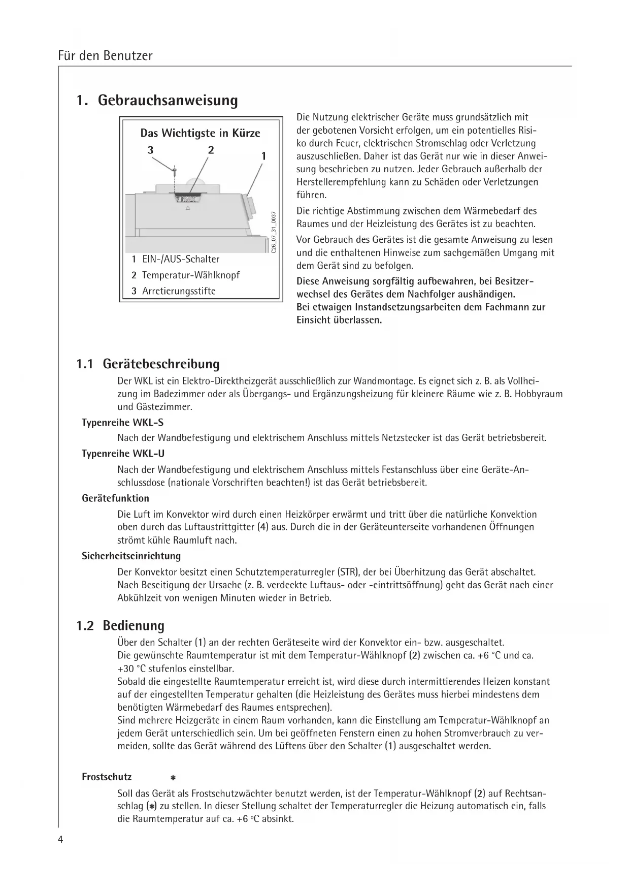 Der WKL ist ein Elektro-Direktheizgerät ausschließlich zur Wandmontage. Es eignet sich z. B. als Vollhei- zung im Badezimmer oder als Übergangs- und Ergänzungsheizung für kleinere Räume wie z. B. Hobbyraum und Gästezimmer. Typenreihe WKL-S Nach der Wandbefestigung und elektrischem Anschluss mittels Netzstecker ist das Gerät betriebsbereit. Typenreihe WKL-U Nach der Wandbefestigung und elektrischem Anschluss mittels Festanschluss über eine Geräte-An- schlussdose (nationale Vorschriften beachten!) ist das Gerät betriebsbereit. Gerätefunktion Die Luft im Konvektor wird durch einen Heizkörper erwärmt und tritt über die natürliche Konvektion oben durch das Luftaustrittgitter (4) aus. Durch die in der Geräteunterseite vorhandenen Öffnungen strömt kühle Raumluft nach. Sicherheitseinrichtung Der Konvektor besitzt einen Schutztemperaturregler (STR), der bei Überhitzung das Gerät abschaltet. Nach Beseitigung der Ursache (z. B. verdeckte Luftaus- oder -eintrittsöffnung) geht das Gerät nach einer Abkühlzeit von wenigen Minuten wieder in Betrieb.