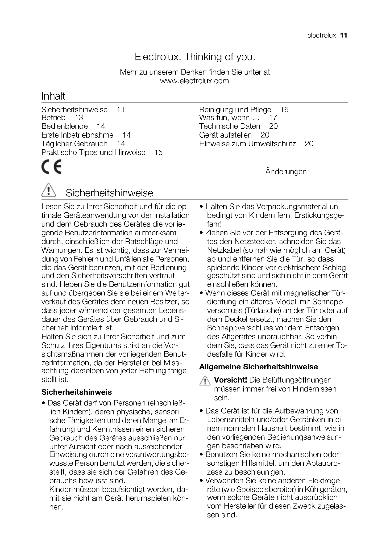 cm fra vægge/skabe. Der skal være tilstrækkelig luftudskiftning bag apparatet. Skån miljøet Symbolet på produktet eller på pakken angiver, at dette produkt ikke må behandles som husholdningsaffald. Det skal i stedet overgives til en affaldsstation for behandling af elektrisk og elektronisk udstyr. Ved at sørge for at dette produkt bliver bortskaffet på den rette måde, hjælper du med til at forebygge eventuelle negative påvirkninger af miljøet og af personers helbred, der ellers kunne forårsages af forkert bortskaffelse af dette produkt. Kontakt det lokale kommunekontor, affaldsselskab eller den forretning, hvor produktet er købt, for yderligere oplysninger om genanvendelse af dette produkt. 10 electroluxElectrolux. Thinking of you. Mehr zu unserem Denken finden Sie unter at www.electrolux.com Inhalt Sicherheitshinweise 11 Betrieb 13 Bedienblende 14 Erste Inbetriebnahme 14 Täglicher Gebrauch 14 Praktische Tipps und Hinweise 15 Reinigung und Pflege 16 Was tun, wenn … 17 Technische Daten 20 Gerät aufstellen 20 Hinweise zum Umweltschutz 20 Änderungen vorbehalten Sicherheitshinweise Lesen Sie zu Ihrer Sicherheit und für die op- timale Geräteanwendung vor der Installation und dem Gebrauch des Gerätes die vorlie- gende Benutzerinformation aufmerksam durch, einschließlich der Ratschläge und Warnungen. Es ist wichtig, dass zur Vermei- dung von Fehlern und Unfällen alle Personen, die das Gerät benutzen, mit der Bedienung und den Sicherheitsvorschriften vertraut sind. Heben Sie die Benutzerinformation gut auf und übergeben Sie sie bei einem Weiter- verkauf des Gerätes dem neuen Besitzer, so dass jeder während der gesamten Lebens- dauer des Gerätes über Gebrauch und Si- cherheit informiert ist. Halten Sie sich zu Ihrer Sicherheit und zum Schutz Ihres Eigentums strikt an die Vor- sichtsmaßnahmen der vorliegenden Benut- zerinformation, da der Hersteller bei Miss- achtung derselben von jeder Haftung freige- stellt ist. Sicherheitshinweis