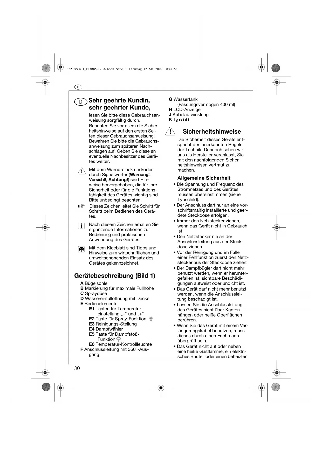 - Den Netzstecker nie an der Anschlussleitung aus der Steck-dose ziehen.• Vor der Reinigung und im Falle einer Fehlfunktion zuerst den Netz-stecker aus der Steckdose ziehen! • Der Dampfbügler darf nicht mehr benutzt werden, wenn er herunter-gefallen ist, sichtbare Beschädi-gungen aufweist oder undicht ist.• Das Gerät darf nicht mehr benutzt werden, wenn die Anschlusslei-tung beschädigt ist. • Lassen Sie die Anschlussleitung des Gerätes nicht über Kanten hängen oder heiße Oberflächen berühren.• Wenn Sie das Gerät mit einem Ver-längerungskabel benutzen, muss dieses durch einen Fachmann überprüft sein.• Das Gerät nicht auf oder neben eine heiße Gasflamme, ein elektri-sches Bauteil oder einen beheizten 822 949 431_EDB8590-EX.book Seite 30 Dienstag, 12. Mai 2009 10:47 22d