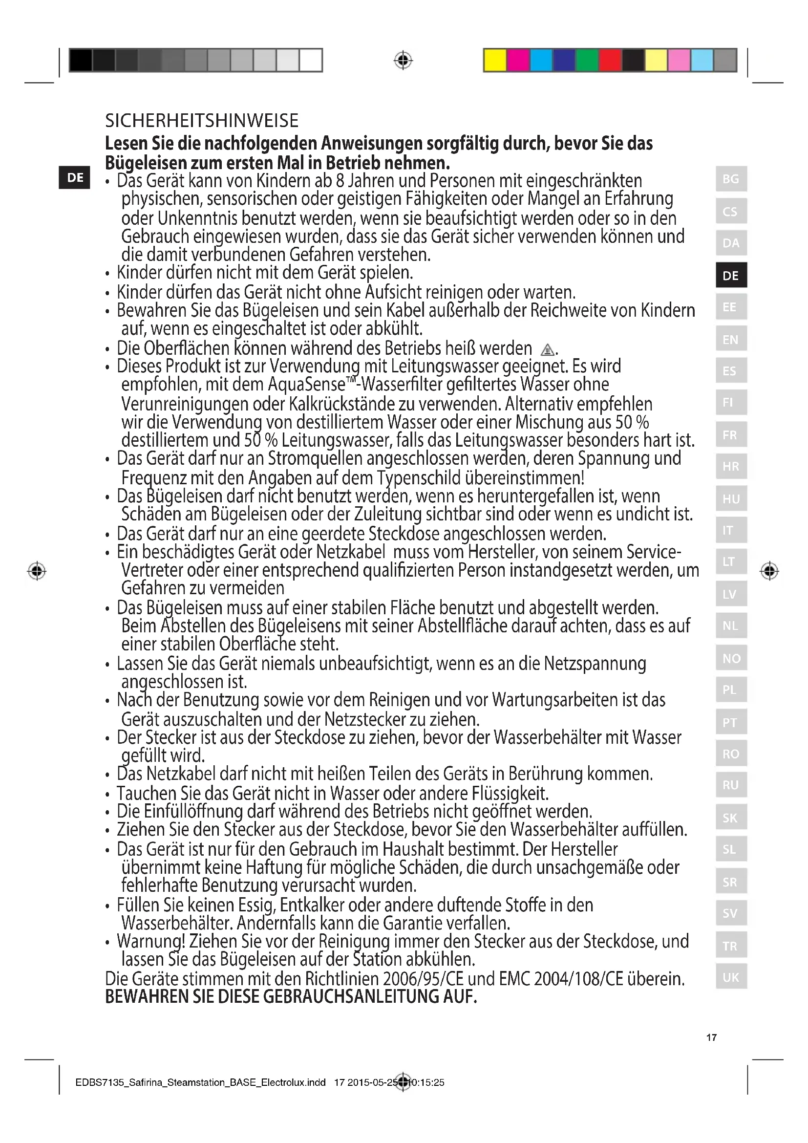 EDBS7135_Safirina_Steamstation_BASE_Electrolux.indd 16 2015-05-25 10:15:25DE SICHERHEITSHINWEISE Lesen Sie die nachfolgenden Anweisungen sorgfältig durch, bevor Sie das Bügeleisen zum ersten Mal in Betrieb nehmen.