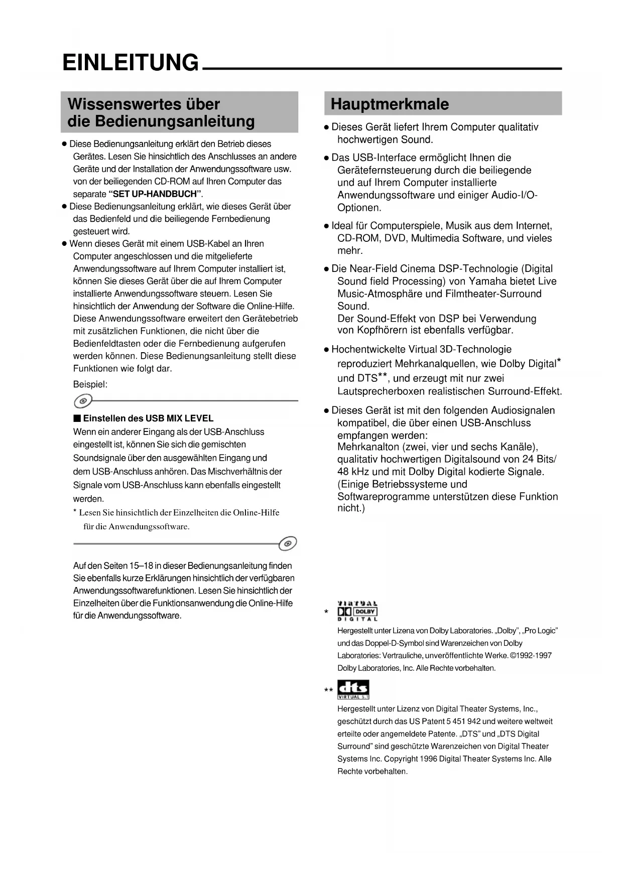 - Les spécifications peuvent être modifiées sans préavis.1 EINLEITUNG Hauptmerkmale ● Dieses Gerät liefert Ihrem Computer qualitativ hochwertigen Sound. ● Das USB-Interface ermöglicht Ihnen die Gerätefernsteuerung durch die beiliegende und auf Ihrem Computer installierte Anwendungssoftware und einiger Audio-I/O- Optionen. ● Ideal für Computerspiele, Musik aus dem Internet, CD-ROM, DVD, Multimedia Software, und vieles mehr. ● Die Near-Field Cinema DSP-Technologie (Digital Sound field Processing) von Yamaha bietet Live Music-Atmosphäre und Filmtheater-Surround Sound. Der Sound-Effekt von DSP bei Verwendung von Kopfhörern ist ebenfalls verfügbar. ● Hochentwickelte Virtual 3D-Technologie reproduziert Mehrkanalquellen, wie Dolby Digital* und DTS**, und erzeugt mit nur zwei Lautsprecherboxen realistischen Surround-Effekt. ● Dieses Gerät ist mit den folgenden Audiosignalen kompatibel, die über einen USB-Anschluss empfangen werden: Mehrkanalton (zwei, vier und sechs Kanäle), qualitativ hochwertigen Digitalsound von 24 Bits/ 48 kHz und mit Dolby Digital kodierte Signale. (Einige Betriebssysteme und Softwareprogramme unterstützen diese Funktion nicht.)