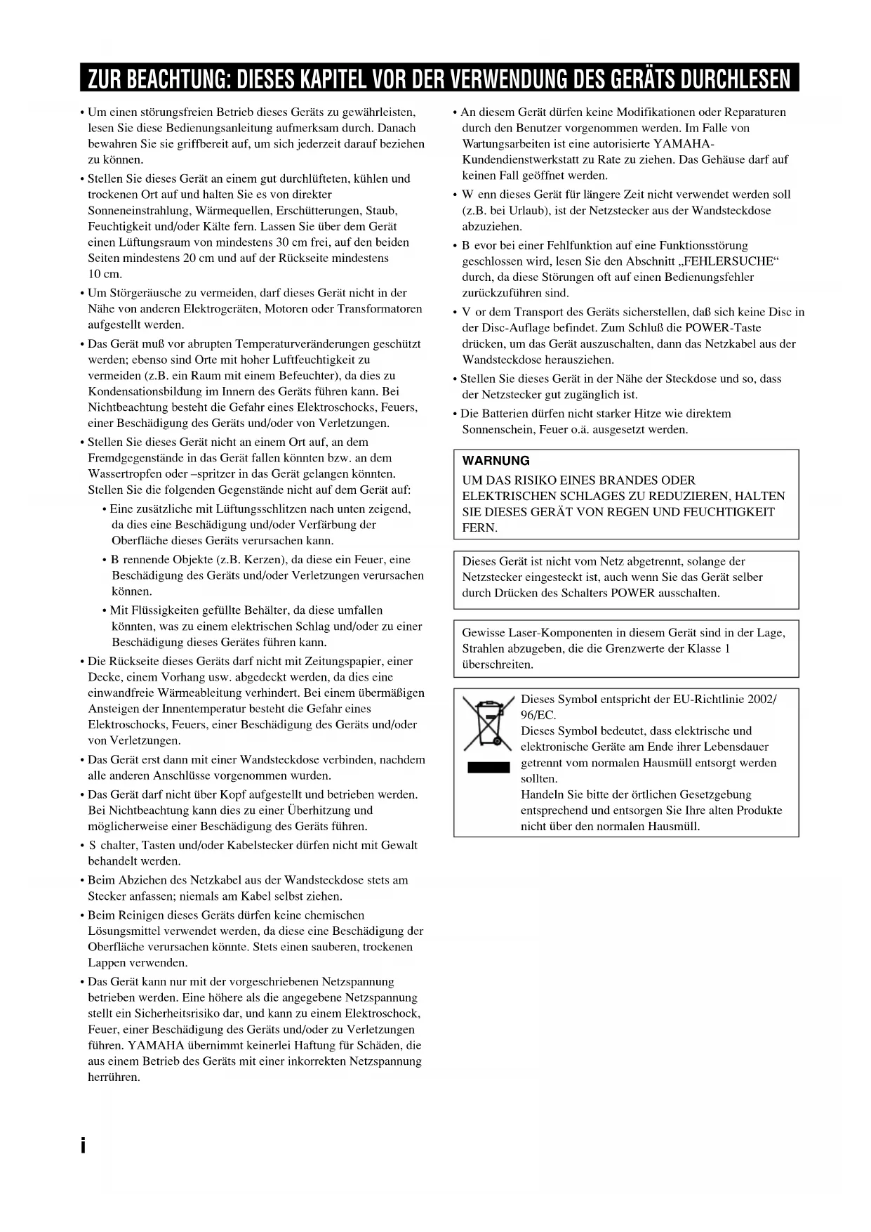 - An diesem Gerät dürfen keine Modifikationen oder Reparaturen durch den Benutzer vorgenommen werden. Im Falle von Wartungsarbeiten ist eine autorisierte YAMAHA- Kundendienstwerkstatt zu Rate zu ziehen. Das Gehäuse darf auf keinen Fall geöffnet werden.