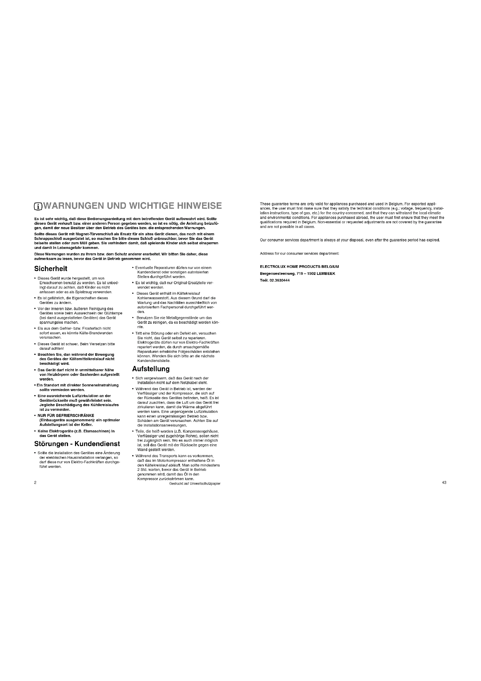 Vor der Inneren bzw. außer Reinigung des Gerätes sowie beim Auswechseln der Glühlampe (bei damit ausgewassteten Geräten) das Gerät spannunglos machen. - Els aus dem Gefrier-bzw. Frosterfach nicht sofort essen, es konnte Kälte-Brandwunden verunschaffen.