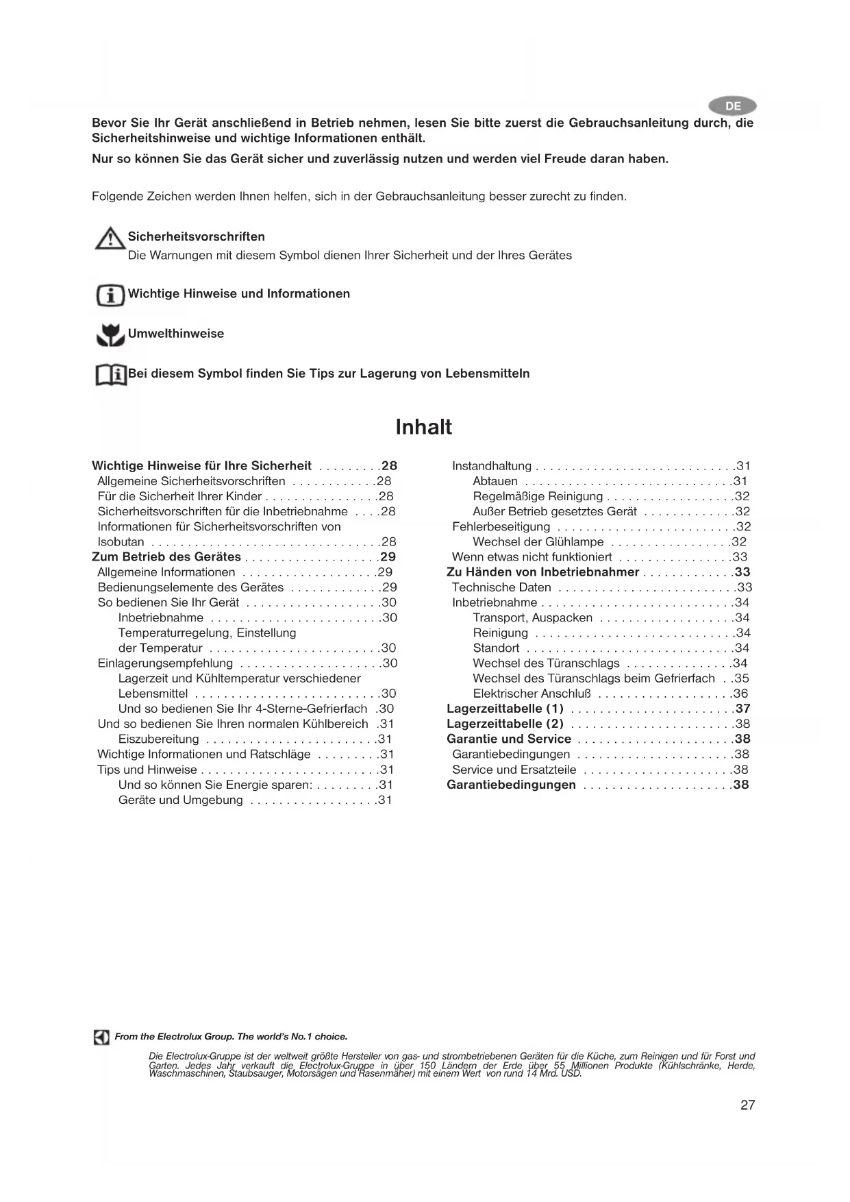 - Bevor Sie Ihr Gerät anschließend in Betrieb nehmen, lesen Sie bitte zuerst die Gebrauchsanleitung durch, die Sicherheitshinweise und wichtige Informationen enthält. Nur so können Sie das Gerät sicher und zuverlässig nutzen und werden viel Freude daran haben. Folgende Zeichen werden Ihnen helfen, sich in der Gebrauchsanleitung besser zurecht zu finden. Sicherheitsvorschriften Die Warnungen mit diesem Symbol dienen Ihrer Sicherheit und der Ihres Gerätes Wichtige Hinweise und Informationen Umwelthinweise Bei diesem Symbol finden Sie Tips zur Lagerung von Lebensmitteln Inhalt Wichtige Hinweise für Ihre Sicherheit p. 28