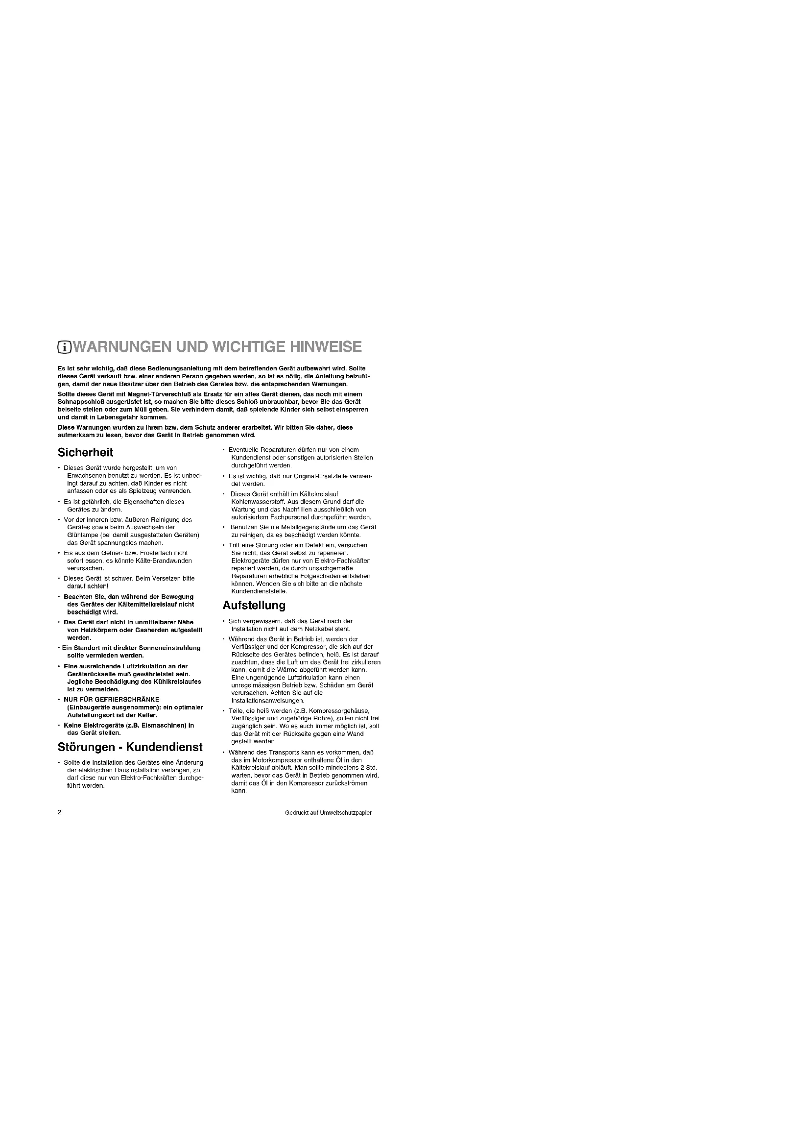 Sollte dieses Gerät mit Magnet-Türverschluß als Ersatz für ein altes Gerät dienen, das noch mit einem Schnappschoß ausgerüstet Ist, so machen Sie bitte dieses Schloß unbrauchbar, bevor Sie das Gerät belseite stellen oder zum Müll geben. Sie verhIndern damit, daß spielende Kinder sich selbst einsperren und damit in Lebensgefahr kommen.