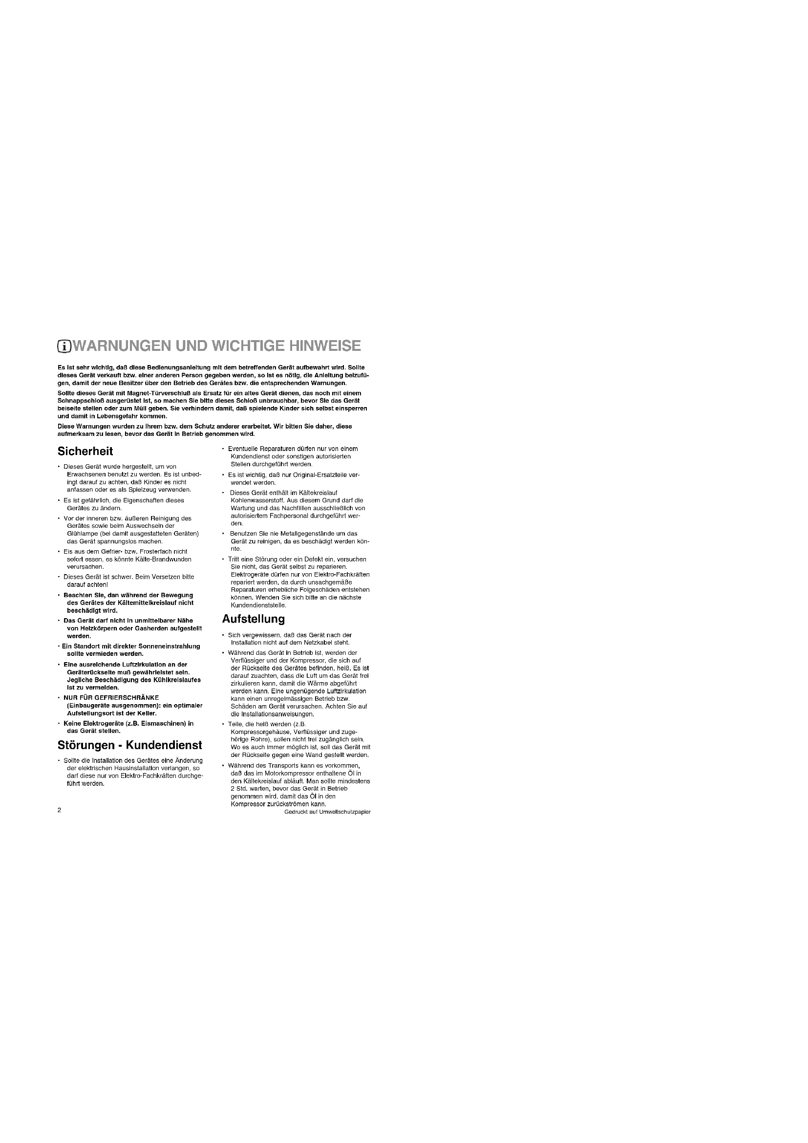 Es ist sehr wichtig, da§ diese Bedienungsanleitung mit dem betreffenden GerŠt aufbewahrt wird. Sollte dieses GerŠt verkauft bzw. einer anderen Person gegeben werden, so ist es nštig, die Anleitung beizufŸ- gen, damit der neue Besitzer Ÿber den Betrieb des GerŠtes bzw. die entsprechenden Warnungen. Sollte dieses GerŠt mit Magnet-TŸrverschlu§ als Ersatz fŸr ein altes GerŠt dienen, das noch mit einem Schnappschlo§ ausgerŸstet ist, so machen Sie bitte dieses Schlo§ unbrauchbar, bevor Sie das GerŠt beiseite stellen oder zum MŸll geben. Sie verhindern damit, da§ spielende Kinder sich selbst einsperren und damit in Lebensgefahr kommen. Diese Warnungen wurden zu Ihrem bzw. dem Schutz anderer erarbeitet. Wir bitten Sie daher, diese aufmerksam zu lesen, bevor das GerŠt in Betrieb genommen wird. Sicherheit ¥ Dieses GerŠt wurde hergestellt, um von Erwachsenen benutzt zu werden. Es ist unbed- ingt darauf zu achten, da§ Kinder es nicht anfassen oder es als Spielzeug verwenden. ¥ Es ist gefŠhrlich, die Eigenschaften dieses GerŠtes zu Šndern. ¥ Vor der inneren bzw. Šu§eren Reinigung des GerŠtes sowie beim Auswechseln der GlŸhlampe (bei damit ausgestatteten GerŠten) das GerŠt spannungslos machen. ¥ Eis aus dem Gefrier- bzw. Frosterfach nicht sofort essen, es kšnnte KŠlte-Brandwunden verursachen. ¥ Dieses GerŠt ist schwer. Beim Versetzen bitte darauf achten! ¥ Beachten Sie, dan wŠhrend der Bewegung des GerŠtes der KŠltemittelkreislauf nicht beschŠdigt wird. ¥ Das GerŠt darf nicht in unmittelbarer NŠhe von Heizkšrpern oder Gasherden aufgestellt werden. ¥ Ein Standort mit direkter Sonneneinstrahlung sollte vermieden werden. ¥ Eine ausreichende Luftzirkulation an der GerŠterŸckseite mu§ gewŠhrleistet sein. Jegliche BeschŠdigung des KŸhlkreislaufes ist zu vermeiden.