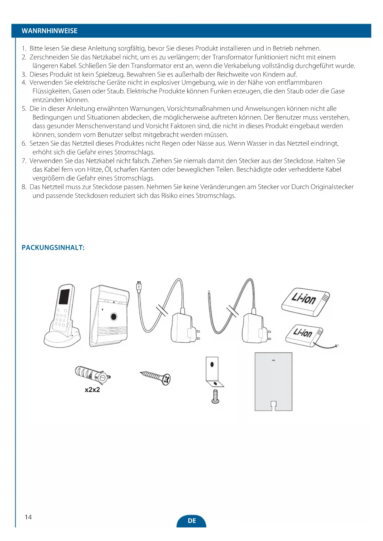 Nur ein Erwachsener darf die Batterien ersetzen und installieren. Entfernen Sie gebrauchte Batterien aus diesem Gerät. Entsorgen Sie die Batterien nicht in Feuer, Sie könnten explodieren oder auslaufen. Schließen Sie keine Batteriepole kurz. Verwenden Sie in diesem Produkt AUSSCHLIESSLICH die mitgelieferten aufladbaren Akkus oder identische Modelle. Lassen Sie dieses Gerät nicht direkt in Kontakt mit Heizquellen oder offenen Flammen geraten. Lassen Sie kein Wasser in Kontakt mit den Batterien oder den Kabeln treten. Installieren Sie mit Vorsicht, um Schäden der Batterie zu vermeiden. Während der Batterieinstallation in dem Fach, stellen Sie die richtige Polarität (+)/(-) sicher. Verwenden Sie nur empfohlene Batterien. Entfernen Sie die Batterien, wenn das Gerät über lange Zeiträume unbenutzt bleibt. Halten Sie das Gerät von kleinen Kindern fern. Halten Sie die ungebrauchten Batterien in ihrer Originalverpackung. Am Ende der Lebensdauer, muss dieses Produkt zu einer Müllwertungsanlage gebracht werden, um die Batterien zu entnehmen.At the end of its life, this product must be returned to a waste processing center in order to extract the batteries.2324 x2 x2 WAARSCHUWING