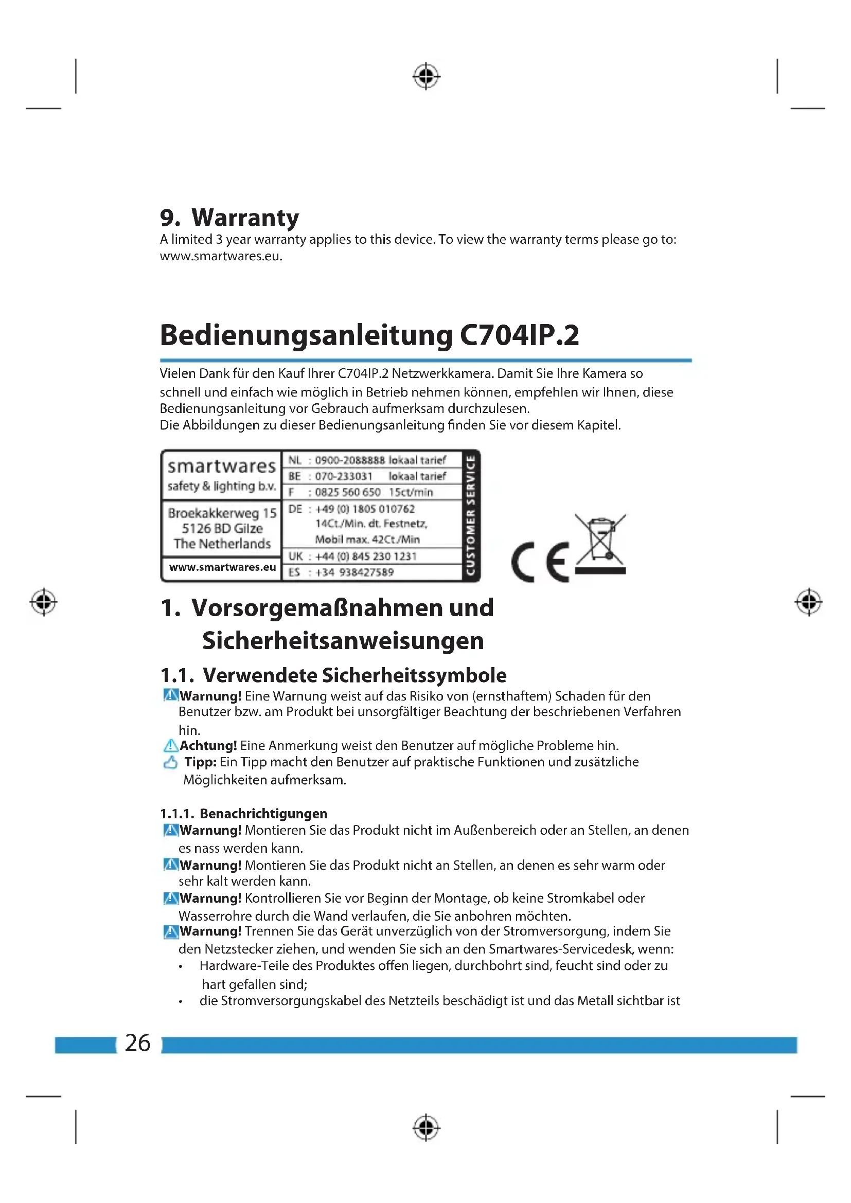 A limited 3 year warranty applies to this device. To view the warranty terms please go to: www.smartwares.eu. Bedienungsanleitung C704IP.2 Vielen Dank für den Kauf Ihrer C704IP.2 Netzwerkkamera. Damit Sie Ihre Kamera so schnell und einfach wie möglich in Betrieb nehmen können, empfehlen wir Ihnen, diese Bedienungsanleitung vor Gebrauch aufmerksam durchzulesen. Die Abbildungen zu dieser Bedienungsanleitung nden Sie vor diesem Kapitel. www.smartwares.eu