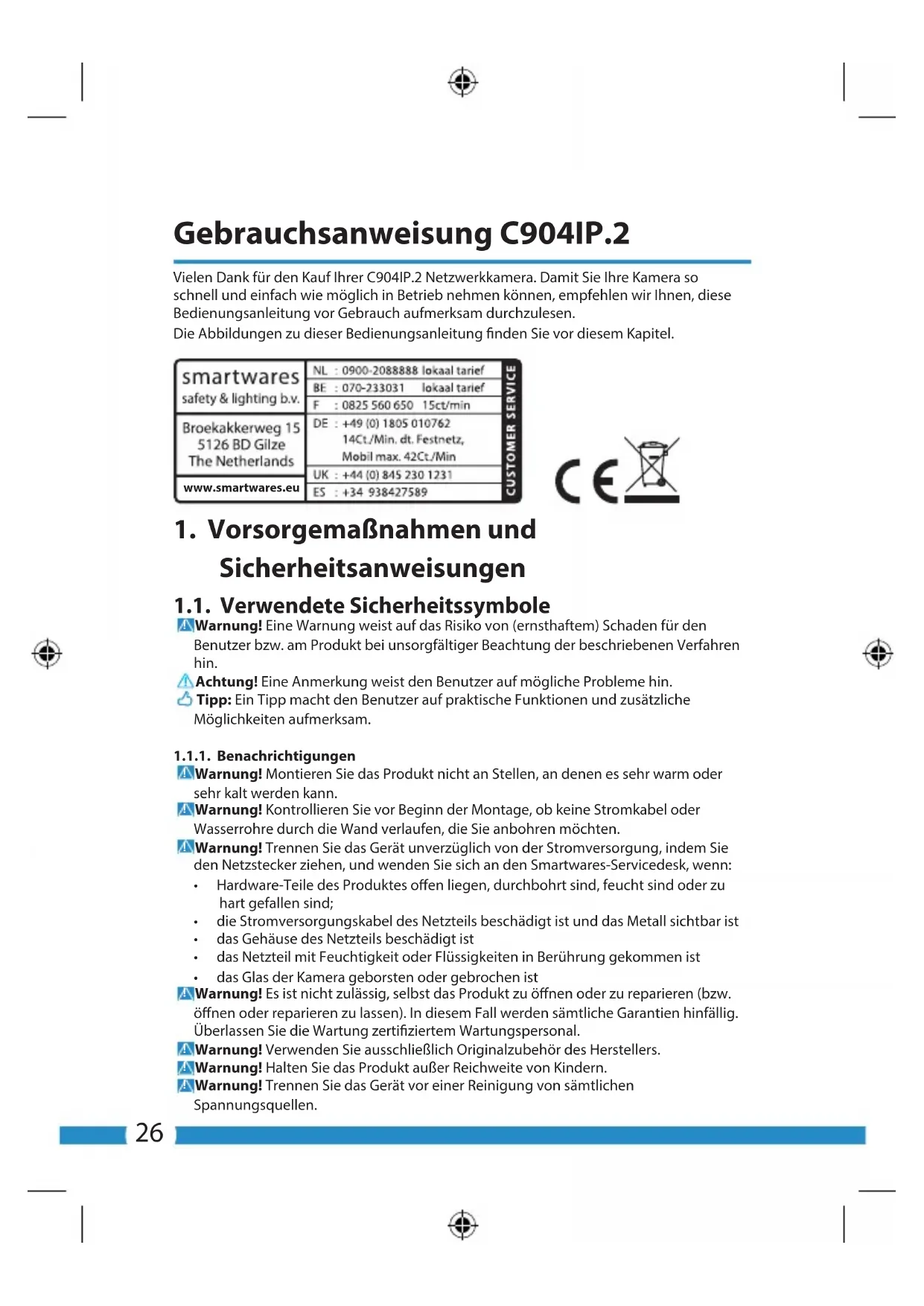 A limited 3 year warranty applies to this device. To view the warranty terms please go to: www.smartwares.eu.26 Gebrauchsanweisung C904IP.2 Vielen Dank für den Kauf Ihrer C904IP.2 Netzwerkkamera. Damit Sie Ihre Kamera so schnell und einfach wie möglich in Betrieb nehmen können, empfehlen wir Ihnen, diese Bedienungsanleitung vor Gebrauch aufmerksam durchzulesen. Die Abbildungen zu dieser Bedienungsanleitung nden Sie vor diesem Kapitel. www.smartwares.eu