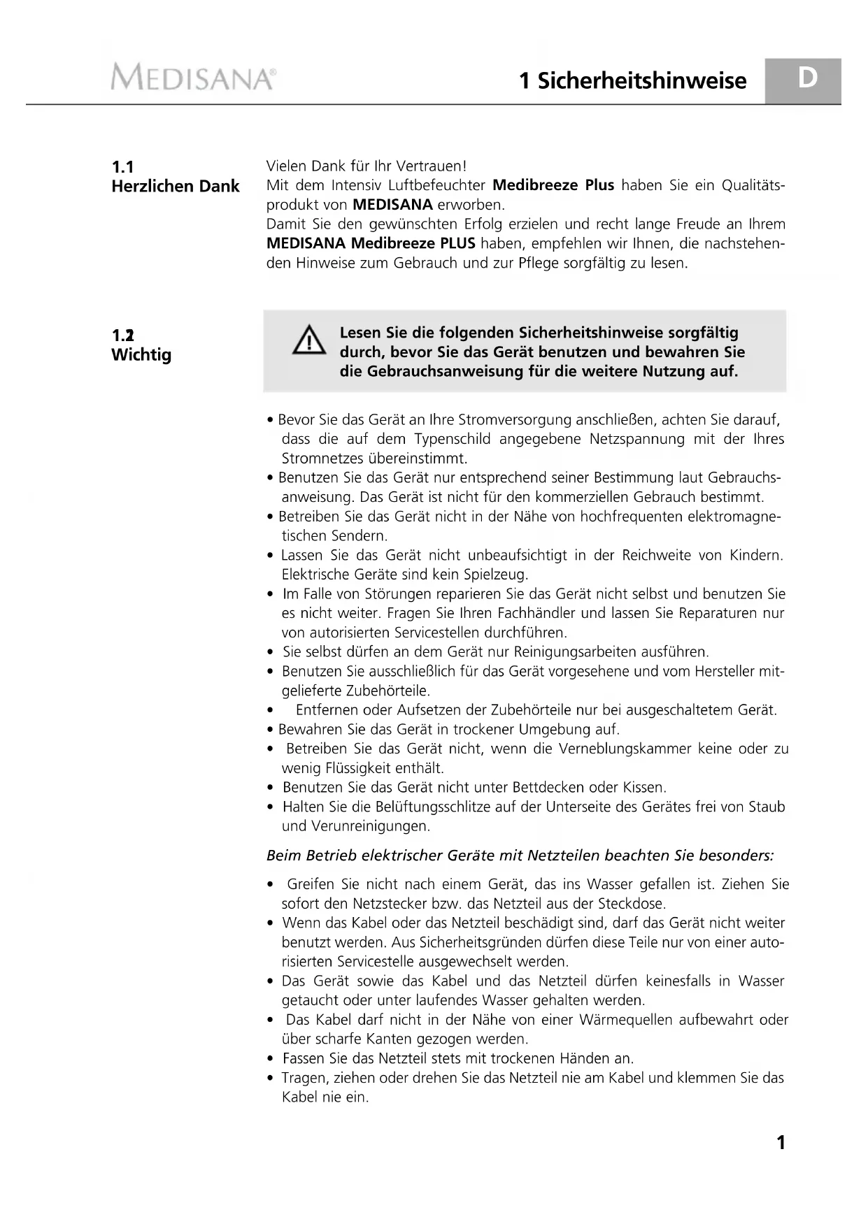 Wichtig Vielen Dank für Ihr Vertrauen! Mit dem Intensiv Luftbefeuchter Medibreeze Plus haben Sie ein Qualitäts- produkt von MEDISANA erworben. Damit Sie den gewünschten Erfolg erzielen und recht lange Freude an Ihrem MEDISANA Medibreeze PLUS haben, empfehlen wir Ihnen, die nachstehen- den Hinweise zum Gebrauch und zur Pflege sorgfältig zu lesen. Lesen Sie die folgenden Sicherheitshinweise sorgfältig durch, bevor Sie das Gerät benutzen und bewahren Sie die Gebrauchsanweisung für die weitere Nutzung auf.