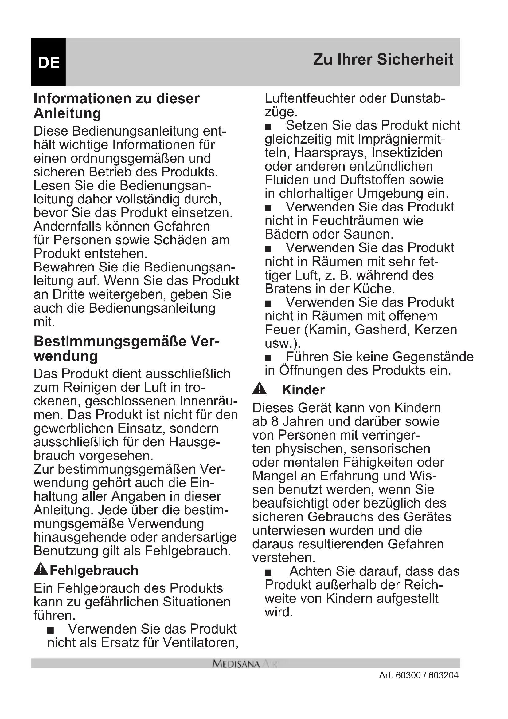 Air 60300 - Luftreiniger MEDISANA - Kostenlose Bedienungsanleitung