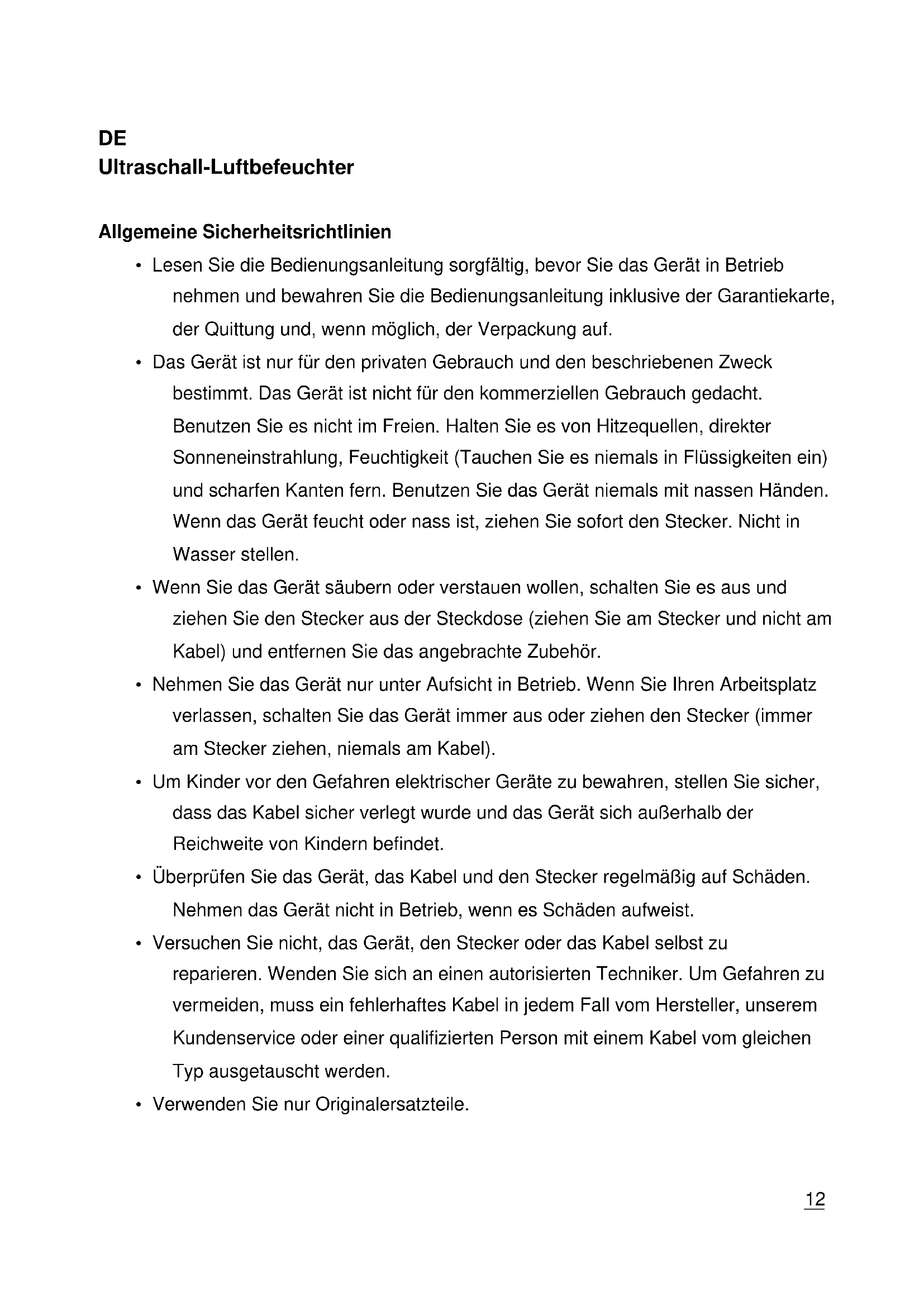 Ultraschall-Luftbefeuchter Allgemeine Sicherheitsrichtlinien