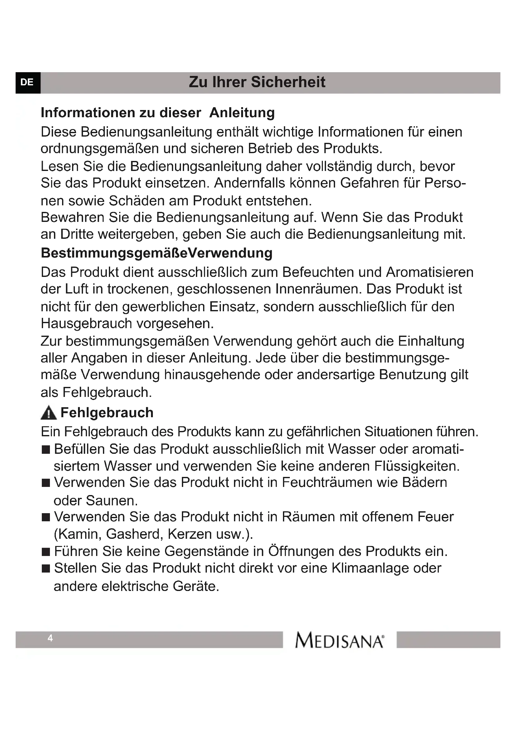 Zu Ihrer Sicherheit Informationen zu dieser Anleitung Diese Bedienungsanleitung enthält wichtige Informationen für einen ordnungsgemäßen und sicheren Betrieb des Produkts. Lesen Sie die Bedienungsanleitung daher vollständig durch, bevor Sie das Produkt einsetzen. Andernfalls können Gefahren für Perso- nen sowie Schäden am Produkt entstehen. Bewahren Sie die Bedienungsanleitung auf. Wenn Sie das Produkt an Dritte weitergeben, geben Sie auch die Bedienungsanleitung mit. Bestimmungsgemäße Verwendung Das Produkt dient ausschließlich zum Befeuchten und Aromatisieren der Luft in trockenen, geschlossenen Innenräumen. Das Produkt ist nicht für den gewerblichen Einsatz, sondern ausschließlich für den Hausgebrauch vorgesehen. Zur bestimmungsgemäßen Verwendung gehört auch die Einhaltung aller Angaben in dieser Anleitung. Jede über die bestimmungsge- mäße Verwendung hinausgehende oder andersartige Benutzung gilt als Fehlgebrauch. Fehlgebrauch Ein Fehlgebrauch des Produkts kann zu gefährlichen Situationen führen. ■ Befüllen Sie das Produkt ausschließlich mit Wasser oder aromati- siertem Wasser und verwenden Sie keine anderen Flüssigkeiten. ■ Verwenden Sie das Produkt nicht in Feuchträumen wie Bädern oder Saunen. ■ Verwenden Sie das Produkt nicht in Räumen mit offenem Feuer (Kamin, Gasherd, Kerzen usw.). ■ Führen Sie keine Gegenstände in Öffnungen des Produkts ein. ■ Stellen Sie das Produkt nicht direkt vor eine Klimaanlage oder andere elektrische Geräte.DE Art. 60086