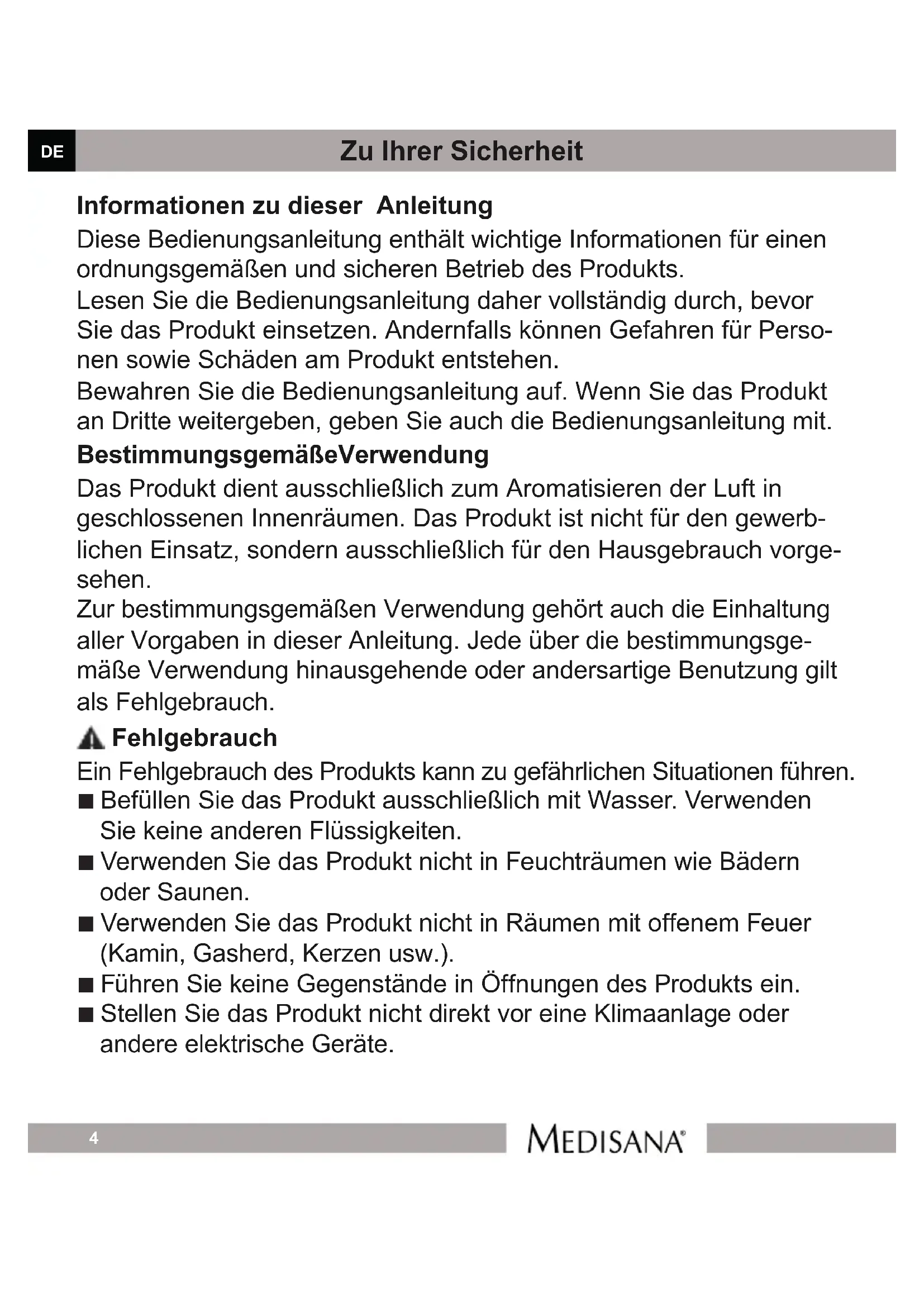 Zu Ihrer Sicherheit Informationen zu dieser Anleitung Diese Bedienungsanleitung enthält wichtige Informationen für einen ordnungsgemäßen und sicheren Betrieb des Produkts. Lesen Sie die Bedienungsanleitung daher vollständig durch, bevor Sie das Produkt einsetzen. Andernfalls können Gefahren für Perso- nen sowie Schäden am Produkt entstehen. Bewahren Sie die Bedienungsanleitung auf. Wenn Sie das Produkt an Dritte weitergeben, geben Sie auch die Bedienungsanleitung mit. Bestimmungsgemäße Verwendung Das Produkt dient ausschließlich zum Aromatisieren der Luft in geschlossenen Innenräumen. Das Produkt ist nicht für den gewerb- lichen Einsatz, sondern ausschließlich für den Hausgebrauch vorge- sehen. Zur bestimmungsgemäßen Verwendung gehört auch die Einhaltung aller Vorgaben in dieser Anleitung. Jede über die bestimmungsge- mäße Verwendung hinausgehende oder andersartige Benutzung gilt als Fehlgebrauch. Fehlgebrauch Ein Fehlgebrauch des Produkts kann zu gefährlichen Situationen führen. ■ Befüllen Sie das Produkt ausschließlich mit Wasser. Verwenden Sie keine anderen Flüssigkeiten. ■ Verwenden Sie das Produkt nicht in Feuchträumen wie Bädern oder Saunen. ■ Verwenden Sie das Produkt nicht in Räumen mit offenem Feuer (Kamin, Gasherd, Kerzen usw.). ■ Führen Sie keine Gegenstände in Öffnungen des Produkts ein. ■ Stellen Sie das Produkt nicht direkt vor eine Klimaanlage oder andere elektrische Geräte.DE Art. 60082 5 Zu Ihrer Sicherheit ■ Das Gerät darf nur mit dem mitgelieferten Netzadapter (HNC240050E) betrieben werden. Kinder Dieses Gerät kann von Kindern ab 8 Jahren und darüber sowie von Personen mit verringerten physischen, sensorischen oder mentalen Fähigkeiten oder Mangel an Erfahrung und Wissen benutzt werden, wenn Sie beaufsichtigt oder bezüglich des sicheren Gebrauchs des Gerätes unterwiesen wurden und die daraus resultierenden Gefahren verstehen. ■ Achten Sie darauf, dass das Produkt außerhalb der Reichweite von Kindern aufgestellt wird. ■ Achten Sie darauf, dass Kinder zu keiner Zeit mit dem Produkt spielen. ■ Reinigung und Benutzer-Wartung dürfen nicht von Kindern ohne Beaufsichtigung durchgeführt werden. ■ Lassen Sie Verpackungsmaterial nicht achtlos herumliegen, es besteht Erstickungsgefahr. Unsachgemäße Hand habung Die unsachgemäße Handhabung des Produkts kann zu Verletzungen führen. ■ Achten Sie auf ein sachgerechtes Anschließen des Produkts. Beachten Sie hierbei diese Bedienungsanleitung. ■ Achten Sie auf eine sachgerechte Verwendung des Produkts. Decken Sie es niemals ab. ■ Beachten Sie, dass eigenmächtiges Umbauen und/oder Verän- dern des Produkts nicht gestattet ist. Im Falle des eigenmächtigen Umbauens und/oder Veränderns erlischt der Garantieanspruch. ■ Öffnen Sie während des Betriebs niemals den Wassertank.DE