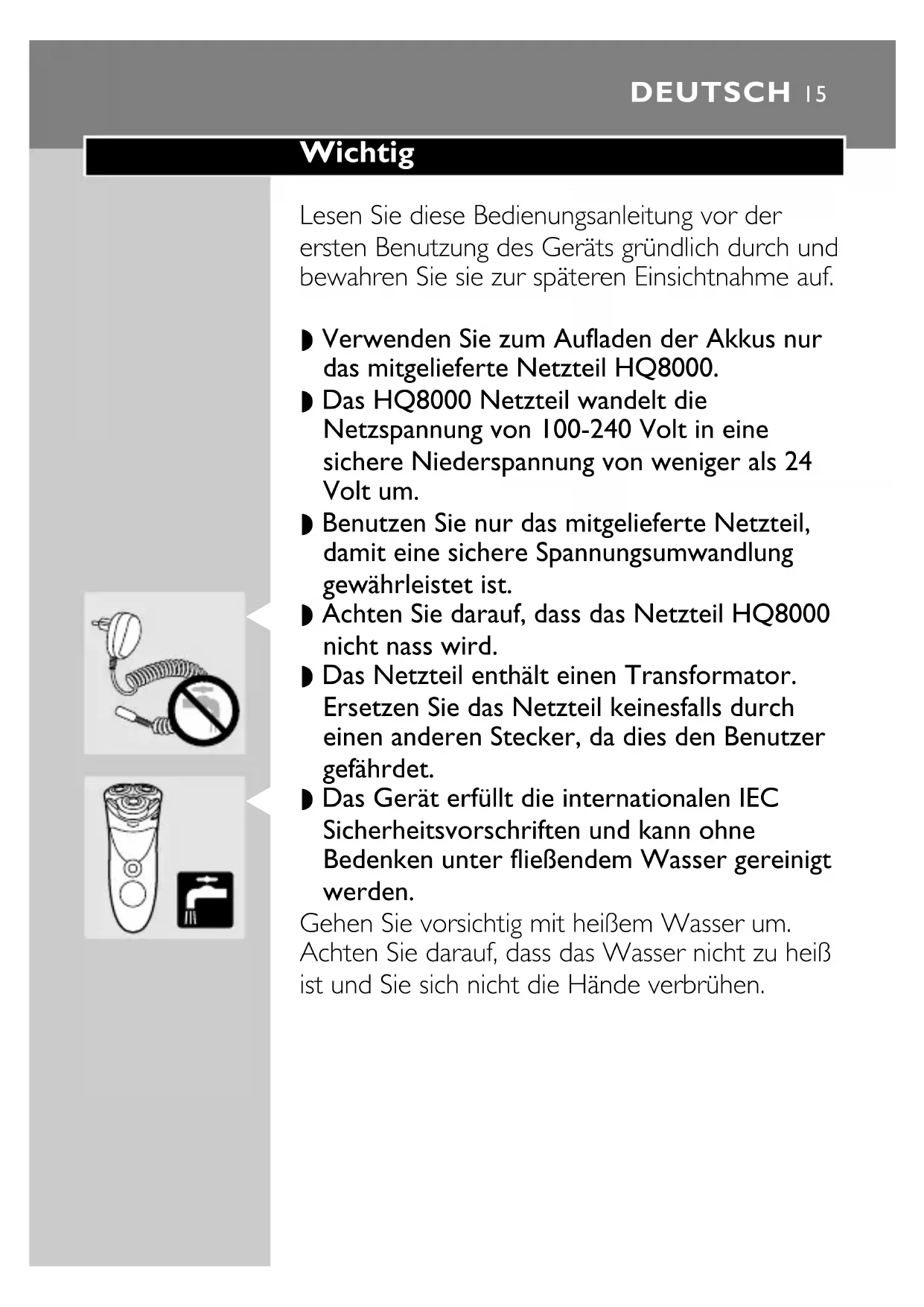 Cause: the batteries are empty. ◗ Recharge the batteries. ENGLISH14Wichtig Lesen Sie diese Bedienungsanleitung vor der ersten Benutzung des Geräts gründlich durch und bewahren Sie sie zur späteren Einsichtnahme auf. ◗ Verwenden Sie zum Aufladen der Akkus nur das mitgelieferte Netzteil HQ8000. ◗ Das HQ8000 Netzteil wandelt die Netzspannung von 100-240 Volt in eine sichere Niederspannung von weniger als 24 Volt um. ◗ Benutzen Sie nur das mitgelieferte Netzteil, damit eine sichere Spannungsumwandlung gewährleistet ist.