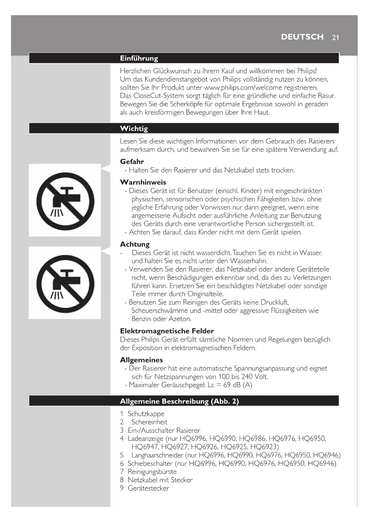 Langhaarschneider (nur HQ6996, HQ6990, HQ6976, HQ6950, HQ6946) 6 Schiebeschalter (nur HQ6996, HQ6990, HQ6976, HQ6950, HQ6946) 7 Reinigungsbürste 8 Netzkabel mit Stecker 9 Gerätestecker DEUTSCHLaden Laden Sie das Gerät auf, - bevor Sie es zum ersten Mal benutzen und nachdem Sie es für längere Zeit nicht benutzt haben. - wenn der Motor anhält oder langsamer läuft. Wenn Sie den Rasierer zum ersten Mal geladen haben und wenn Sie ihn längere Zeit nicht benutzt haben, können Sie die Akkuleistung folgendermaßen optimieren: 1 Sie können die Akkuleistung optimieren, indem Sie den Rasierer vollständigauadenundanschließendnormalverwenden,bisder Akku leer ist. Wiederholen Sie diesen Vorgang dreimal nach einander. Wenn Sie die Akkuleistung auf diese Weise optimieren, können Sie denRasiererauchdannzwischendenRasurenauaden,wennder Akku noch nicht ganz leer ist. Den Rasierer auaden (nur HQ6996, HQ6990, HQ6986, HQ6976, HQ6950, HQ6947, HQ6927, HQ6926, HQ6925, HQ6923) Schnellladung (nur HQ6996, HQ6990, HQ6986) Schon nach 3 Minuten Ladezeit reicht die Akkukapazität für eine kabellose Rasur. 1 Stecken Sie den Gerätestecker in den Rasierer. 2 Stecken Sie den Netzstecker in eine Steckdose. Hinweis: Achten Sie darauf, dass das Gerät ausgeschaltet ist. , Die Ladeanzeige leuchtet auf. , HQ6996, HQ6990, HQ6986: Laden Sie den Rasierer mindestens 1 Stunde lang auf, aber nicht mehr als 24 Stunden. Wenn der Akku vollständig aufgeladen ist, beginnt die Ladeanzeige zu blinken. , HQ6976, HQ6950, HQ6947, HQ6927, HQ6926, HQ6925, HQ6923: Laden Sie den Rasierer mindestens 8 Stunden lang auf, aber nicht mehr als 24 Stunden. Hinweis: Lassen Sie den Rasierer nicht ständig am Stromnetz angeschlossen. Hinweis: Sie können sich auch bei leerem Akku rasieren. Schließen Sie dazu den Rasierapparat an das Netz an. 3 Ziehen Sie das Netzteil aus der Steckdose und den Gerätestecker vom Rasierer, sobald der Akku vollständig aufgeladen ist. Das Gerät benutzen Nur HQ6946, HQ6906, HQ6902: 1 Stecken Sie den Gerätestecker in den Rasierer. 2 Stecken Sie den Netzstecker in eine Steckdose. DEUTSCH22Rasieren 1 Schieben Sie den Ein-/Ausschalter nach oben, um den Rasierer einzuschalten. 2 Führen Sie den Rasierer mit kreisenden Bewegungen über die Haut. Die beste Rasur erzielen Sie bei trockener Haut. Es kann 2 bis 3 Wochen dauern, bis sich Ihre Haut an das Philips Schersystem gewöhnt hat. 3 Schieben Sie den Ein-/Ausschalter nach unten, um den Rasierer auszuschalten. 4 Setzen Sie die Schutzkappe nach jedem Gebrauch auf den Rasierer, um Beschädigungen zu vermeiden. Trimmen (nur HQ6996, HQ6990, HQ6976, HQ6950, HQ6946) Der Langhaarschneider eignet sich zum Trimmen von Koteletten und Schnurrbart. 1 Schieben Sie den Schiebeschalter nach oben, um den Langhaarschneider zu öffnen. Der Langhaarschneider lässt sich bei laufendem Motor aktivieren. Reinigung und Pege Regelmäßiges Reinigen des Geräts sorgt für bessere Rasierergebnisse. Dieses Gerät ist nicht wasserdicht. Tauchen Sie es nicht in Wasser, und halten Sie es nicht unter den Wasserhahn. Benutzen Sie zum Reinigen des Geräts keine Scheuerschwämme und -mittel oder aggressive Flüssigkeiten wie Benzin oder Azeton. - Verwenden Sie das Reinigungsspray für Philips Scherköpfe (Typ HQ110) für eine schnelle und gründliche Reinigung. Fragen Sie Ihren Philips Händler. Hinweis: Das Reinigungsspray für Philips Scherköpfe ist möglicherweise nicht in jedem Land erhältlich. Das Philips Service-Center in Ihrem Land kann Ihnen Auskunft über die Verfügbarkeit dieses Zubehörs geben. Sie können den Rasierer auch auf die folgende Weise reinigen: DEUTSCH 23Einmal wöchentlich: Schereinheit und Haarauffangkammer 1 Schalten Sie das Gerät aus, ziehen Sie das Netzteil aus der Steckdose und den Gerätestecker vom Rasierer. 2 Reinigen Sie zuerst den oberen Teil des Geräts mit der beiliegenden Reinigungsbürste. 3 Drücken Sie die Entriegelungstaste (1), und nehmen Sie die Schereinheit ab (2). 4 Reinigen Sie die Schereinheit und die Haarauffangkammer von innen mit der Reinigungsbürste. 5 Setzen Sie die Schereinheit wieder auf den Rasierer. DEUTSCH24Jeden Monat: Scherköpfe 1 Schalten Sie das Gerät aus, ziehen Sie das Netzteil aus der Steckdose und den Gerätestecker vom Rasierer. 2 Drücken Sie die Entriegelungstaste (1), und nehmen Sie die Schereinheit ab (2). 3 DrehenSiedasRädchengegendenUhrzeigersinn(1), und entnehmen Sie den Scherkopfhalter (2). 4 Entfernen Sie die Scherköpfe (Schermesser und Scherkörbe) einzeln, und reinigen Sie sie mit der im Lieferumfang enthaltenen Reinigungsbürste. Hinweis: Reinigen Sie immer nur ein Schermesser mit dem dazugehörigen Scherkorb, da die Paare jeweils aufeinander eingeschliffen sind. Werden Schermesser und Scherkörbe versehentlich miteinander vertauscht, kann es mehrere Wochen dauern, bis wieder die optimale Rasierleistung erreicht wird. 5 Reinigen Sie das Schermesser mit der kurzborstigen Seite der Reinigungsbürste. Bürsten Sie dabei vorsichtig in Pfeilrichtung. 6 Bürsten Sie den Scherkorb ab. DEUTSCH 257 Setzen Sie die Scherköpfe wieder in die Schereinheit ein, setzen Sie den Scherkopfhalter wieder ein, drücken Sie ihn nach unten (1), unddrehenSiedasRädchenimUhrzeigersinnfest(2). 8 Setzen Sie die Schereinheit wieder auf den Rasierer. Extragründliche Reinigung Für eine besonders gründliche Reinigung können Sie die Scherköpfe alle sechs Monate in eine fettlösende Flüssigkeit (z. B. Alkohol) tauchen. Befolgen Sie beim Entnehmen der Scherköpfe die oben beschriebenen Schritte 1 bis 4. Sie sollten dann nach dem Reinigen einen Tropfen Nähmaschinenöl in die Mitte der Scherkörbe geben, um eine Abnutzung der Scherköpfe zu verhindern. Langhaarschneider (nur HQ6996, HQ6990, HQ6976, HQ6950, HQ6946) Reinigen Sie den Langhaarschneider nach jedem Gebrauch. 1 Schalten Sie das Gerät aus, ziehen Sie das Netzteil aus der Steckdose und den Gerätestecker vom Rasierer. 2 Reinigen Sie den Langhaarschneider mit der beiliegenden Reinigun