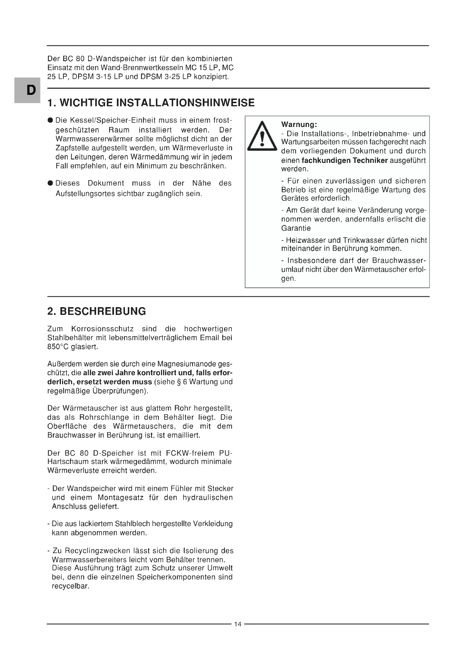 Warnung: - Die Installations-, Inbetriebnahme- und Wartungsarbeiten müssen fachgerecht nach dem vorliegenden Dokument und durch einen fachkundigen Techniker ausgeführt werden. - Für einen zuverlässigen und sicheren Betrieb ist eine regelmäßige Wartung des Gerätes erforderlich. - Am Gerät darf keine Veränderung vorge- nommen werden, andernfalls erlischt die Garantie - Heizwasser und Trinkwasser dürfen nicht miteinander in Berührung kommen. - Insbesondere darf der Brauchwasser- umlauf nicht über den Wärmetauscher erfol- gen. D15