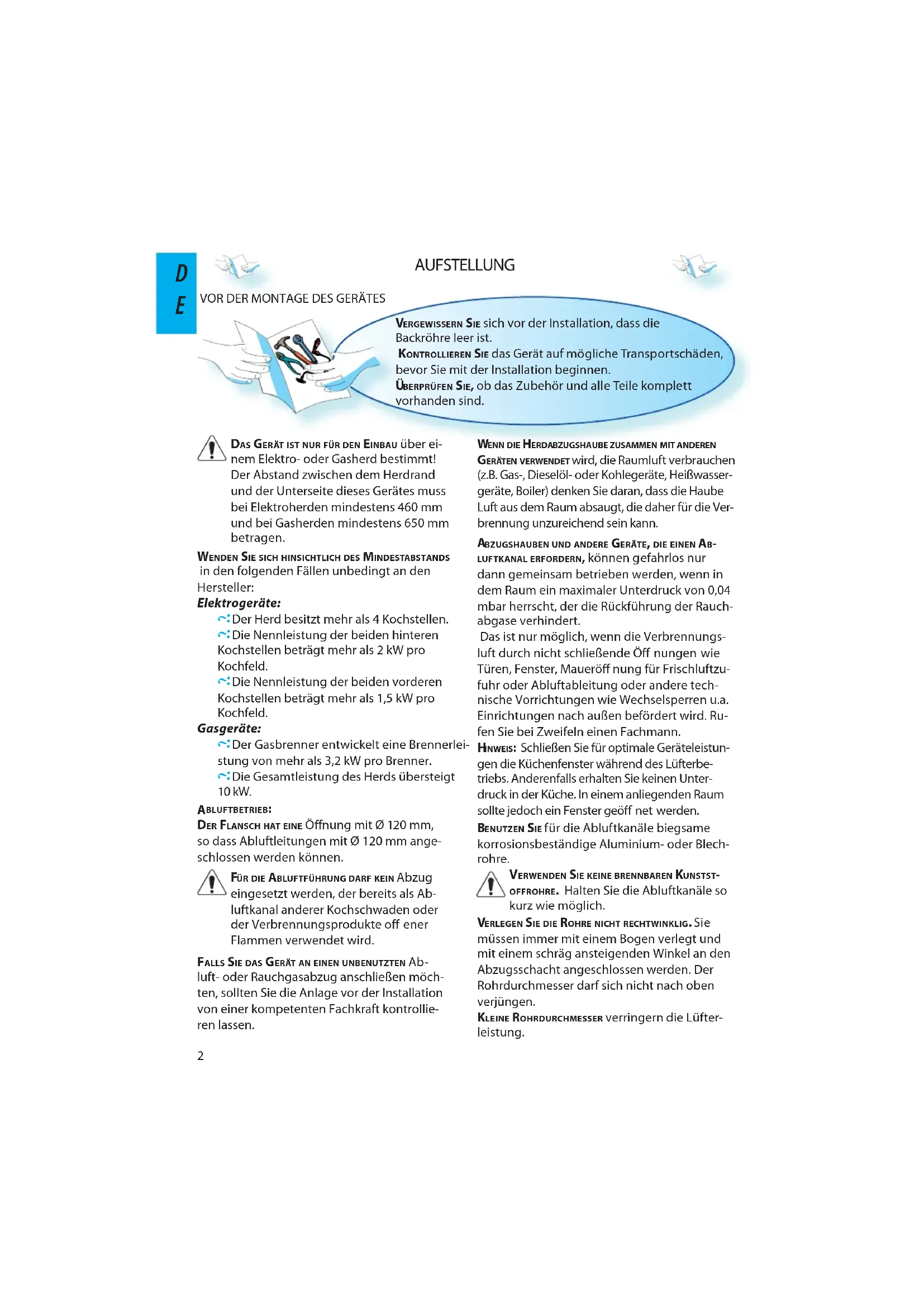 ALLS SIE DAS GERÄT AN EINEN UNBENUTZTEN Ab- luft- oder Rauchgasabzug anschließen möch- ten, sollten Sie die Anlage vor der Installation von einer kompetenten Fachkraft kontrollie- ren lassen.