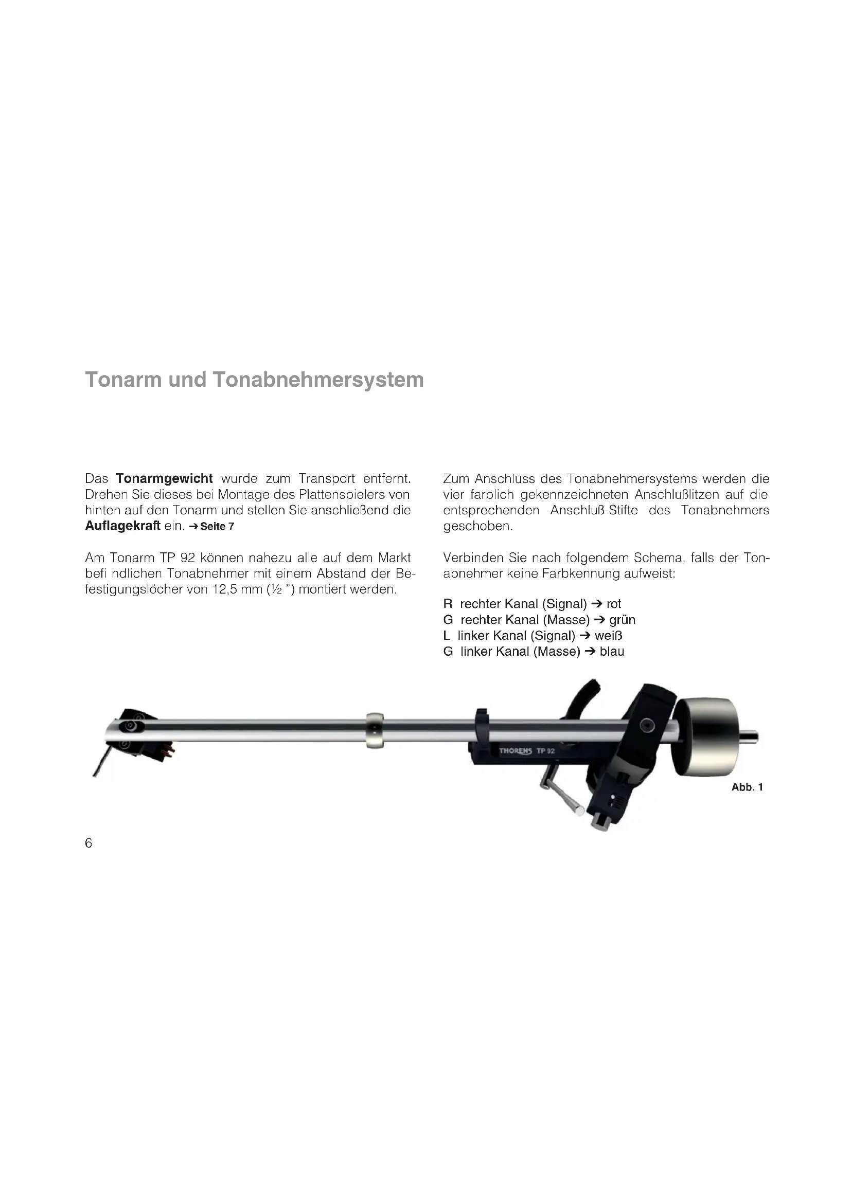 TECHNICAL SPECIFICATIONS 18 Table of Contents Sommaire6 Tonarm und Tonabnehmersystem Abb. 1 Das Tonarmgewicht wurde zum Transport entfernt. Drehen Sie dieses bei Montage des Plattenspielers von hinten auf den Tonarm und stellen Sie anschließend die Au agekraft ein. ➔ Seite 7 Am Tonarm TP 92 können nahezu alle auf dem Markt befi ndlichen Tonabnehmer mit einem Abstand der Be- festigungslöcher von 12,5 mm (½ ”) montiert werden. Zum Anschluss des Tonabnehmersystems werden die vier farblich gekennzeichneten Anschlußlitzen auf die entsprechenden Anschluß-Stifte des Tonabnehmers geschoben. Verbinden Sie nach folgendem Schema, falls der Ton- abnehmer keine Farbkennung aufweist: R rechter Kanal (Signal) ➔ rot G rechter Kanal (Masse) ➔ grün L linker Kanal (Signal) ➔ weiß G linker Kanal (Masse) ➔ blau7 Au agekraft Die Einstellung der Au agekraft erfolgt durch Drehen des Tonarmgewichts (➔ Abb. 2). Je weiter das Gewicht nach vorne zum Tonabnehmer hin gedreht wird, desto größer wird die Aufl agekraft. Die korrekte Aufl agekraft können Sie mit Hilfe der beilie- genden Tonarmwaage einstellen. Schwenken Sie hier- zu den Tonarm bei abgesenktem Tonarmlift über den Plattenteller und senken Sie ihn vorsichtig ab, so dass die Nadel auf der Tonarmwaage aufl iegt. Entfernen Sie dabei unbedingt die Schutzhaube des Tonabnehmers. Gehen Sie äußerst vorsichtig vor, um die Nadel des Tonabnehmers nicht zu beschädigen! Hinweis: Die korrekte Au agekraft ist vom verwen- deten Tonabnehmer abhängig. Bitte konsultieren Sie hierzu die Bedienungsanleitung Ihres Tonabnehmers. Abb. 2 Das in der Mitte des Tonarmrohres angebrachte Ringgewicht (➔ Abb. 1) darf nicht verschoben werden. Es handelt sich um einen Resonanzdämpfer, der nur exakt an dieser Position wirksam ist!8 Antiskatingkraft Durch Zusammenwirken der Reibungskraft der Platten- rillen mit den Lagerkräften am Tonabnehmer wird beim Abspielen einer Schallplatte eine Kraftkomponente er- zeugt, die den Tonarm nach innen zieht: Die Skating- kraft. Zu ihrer Kompensation dient die Antiskatingkraft, welche beim Tonarm TP 92 durch einen eingebauten Magneten erzeugt wird. Die Antiskatingkraft ist bei Auslieferung voreingestellt, sie kann jedoch bei Bedarf über eine Stellschraube (➔ Abb. 3) angepasst werden. Drehen Sie entgegen dem Uhrzeigersinn um die Kraft zu erhöhen und im Uhrzeigersinn um die Kraft zu verringern. Der weiße Punkt über der Stellschraube dient dabei der Anzeige der aktuellen Einstellung. Die benötigte Antiskatingkraft ist vom verwendeten Tonabnehmer abhängig und sollte bei einem Wech- sel mithilfe einer Meßschallplatte ermittelt werden. Abb. 3Weitere Tonarmeinstellungen Der Überhang kann beim Wechseln des Tonabnehmers am Headshell um ± 2,5 mm angepasst werden. Lösen Sie hierzu die Schraube oberhalb des Headshells und verschieben Sie dieses entsprechend. ➔ Abb. 4 Am hinteren Ende des Tonarmrohrs kann der Überhang um weitere ± 3 mm und der Azimuth um ± 5° angepasst werden. Lösen Sie hierzu die Schraube oben am Lager- block mit einem Inbusschlüssel SW 2 ➔ Abb. 5 Änderung des VTA ➔ Seite 10 Die Schrauben dürfen nach der Anpassung nicht zu sehr festgezogen werden! Abb. 4 Abb. 5