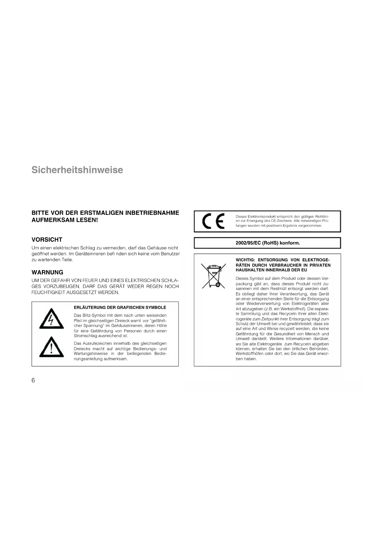 AUFMERKSAM LESEN! VORSICHT Um einen elektrischen Schlag zu vermeiden, darf das Gehäuse nicht geöffnet werden. Im Geräteinneren befi nden sich keine vom Benutzer zu wartenden Teile.