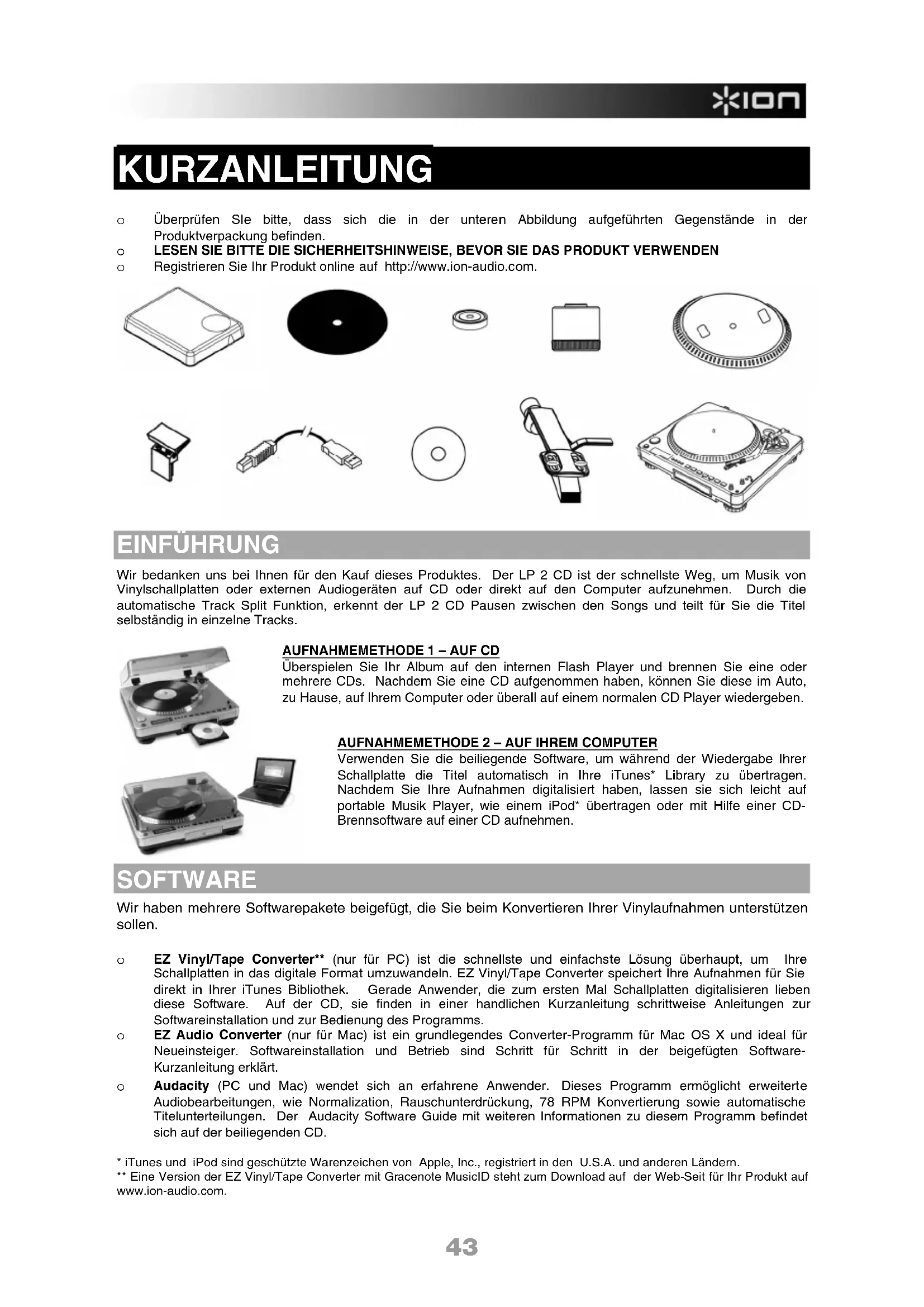 EZ Vinyl/Tape Converter** (nur für PC) ist die schnellste und einfache Lösung überhaupt, um ihre Schallplatten in das digitale Format umzuwandeln. EZ Vinyl/Tape Converter speichert ihre Aufnahmen für Sie direkt in ihrer iTunes Bibliothek. Gerade Anwender, die zum ersten Mal Schallplatten digitalisieren lieben diese Software. Auf der CD, sie finden in einer handlichen Kurzanleitung schrittweise Anleitungen zur Softwareinstallation und zur Bedienung des Programms.