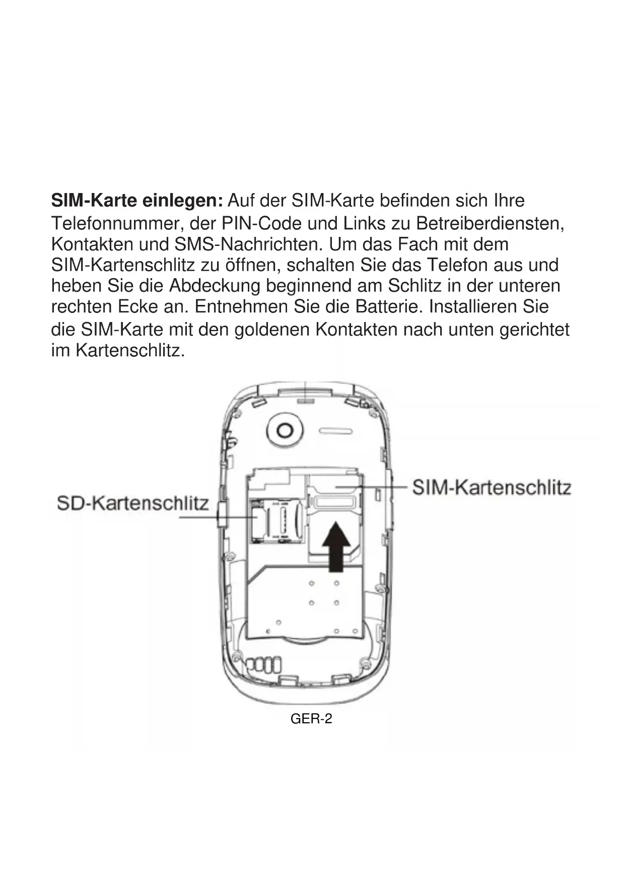 Speicherkarte installieren: Für die Nutzung der Kamera und der Funktionen des Media Players ist eine SD-Speicherkarte erforderlich (nicht enthalten): Installieren Sie die Kare an der Rückseite des Telefons links neben dem SIM-Kartenschlitz. Installieren Sie die MicroSD-Karte wie dargestellt mit den goldenen Kontakten nach unten gerichtet: Öffnen Sie den Metallverschluss, indem Sie ihn nach „oben“ drücken. Verriegeln Sie den Verschluss nach der Installation der Speicherkarte, indem Sie ihn in die entgegengesetzte Richtung („schließen“) schieben. EINSCHALTEN, AUSSCHALTEN und Tastensperre: Halten Sie die rote Taste zum Beenden von Anrufen gedrückt, um das Telefon ein- und auszuschalten. Die Tastatur wird durch Zuklappen des Telefons gesperrt. Verbindung mit einem PC: Verwenden Sie ein USB-Kabel, um das GSP-130 mit einem Computer zu verbinden. Wählen Sie an Ihrem Telefon USB-Gerät . Speichern Sie Titel, die Sie mit dem Musik Player wiedergeben möchten, im Ordner „Meine Musik“ auf der SD-Karte. Batterien Einsetzen: Ihr Gerät verfügt über eine Lithium-Ion-Batterie und ist ausschließlich für den Gebrauch mitGER-4 Originalbatterien und Originalladegeräten bestimmt. Die Batterie ist an der Rückseite des Telefons zu installieren. Installieren Sie die Batterie so im Batteriefach, dass die Kontakte mit denen des Telefons entsprechend ausgerichtet sind. Installieren Sie danach wieder die rückseitige Abdeckung gemäß den nachfolgenden Abbildungen. Batterie aufladen: Laden Sie die Batterie vor dem Gebrauch des Geräts auf. Schließen Sie das Ladegerät an eine Steckdose und anschließend den Stecker an die Ladestation (warten Sie einen Moment, bis ein Signalton auf den Start des Ladevorgangs hinweist) oder direkt an den Mikro-USB-Port rechts am Telefon an. Nach Abschluss des Ladevorgangs ertönt ein zweiter Signalton.GER-5 Achtung: Um die Funktionsweise des Produkts sowie die Integrität der Garantie zu gewährleisten, empfehlen wir das Gerät nur mit Originalladegeräten zu verwenden. Laden Sie die Batterie in Innenräumen unter trockenen und günstigen Rahmenbedingungen auf.Es ist normal, dass die Batterie während des Ladevorgangs etwas warm wird.Die Batterie erreicht ihre vollständige Kapazität erst nach einigen vollständigen Ladezyklen.GER-6