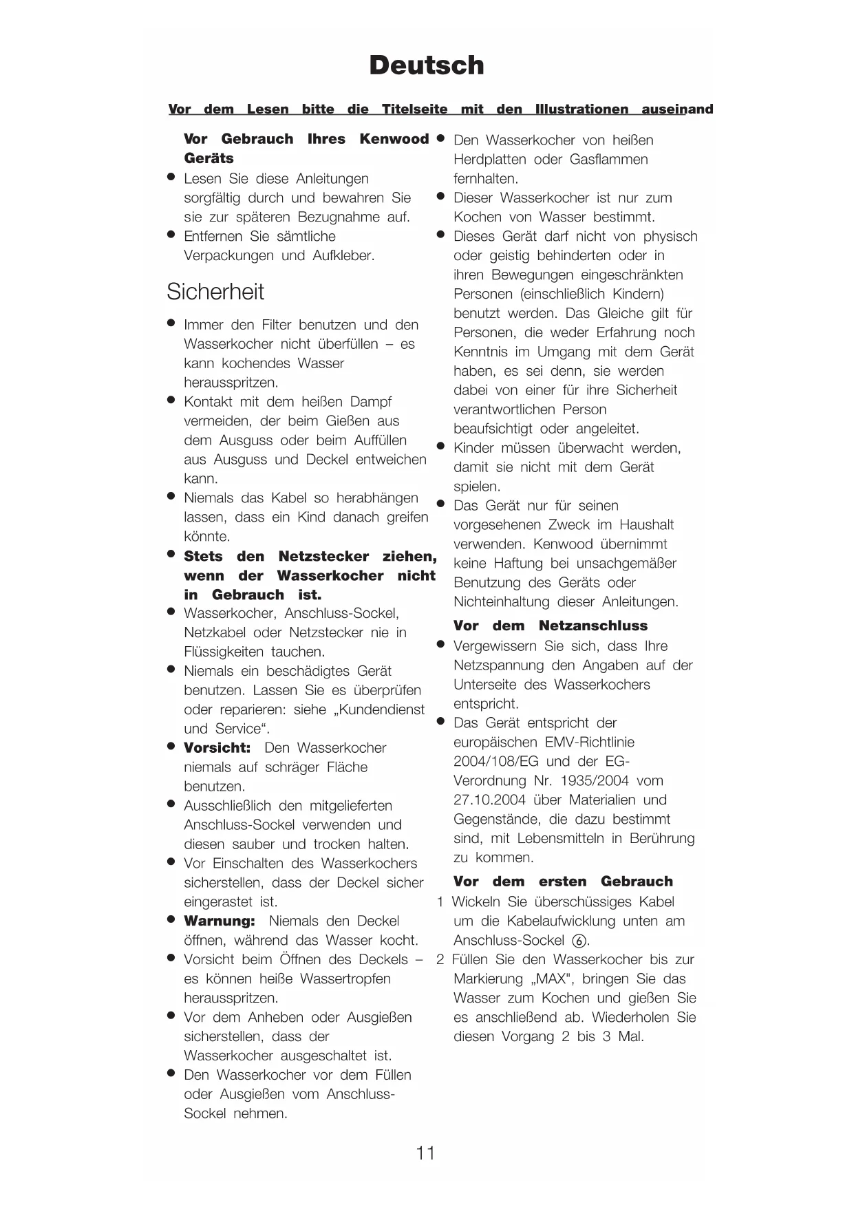 Das Gerät nur für seinen vorgesehenen Zweck im Haushalt verwenden. Kenwood übernimmt keine Haftung bei unsachgemäßer Benutzung des Geräts oder Nichteinhaltung dieser Anleitungen. Vor dem Netzanschluss