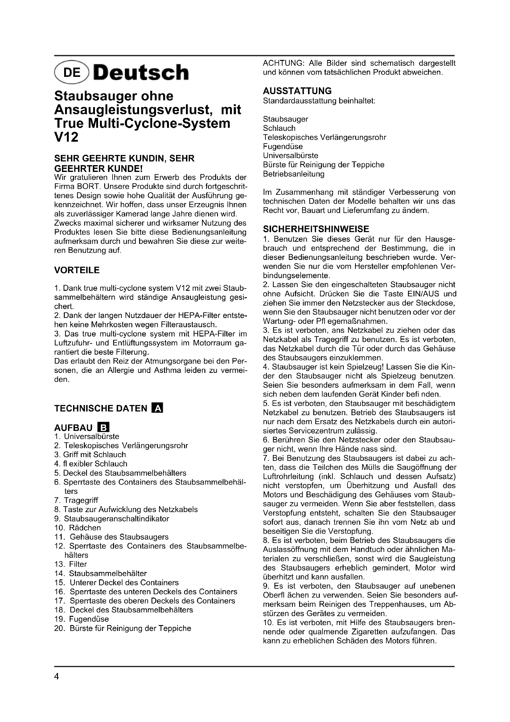 Wir gratulieren Ihnen zum Erwerb des Produkts der Firma BORT. Unsere Produkte sind durch fortgeschrittenes Design sowie hohe Qualität der Ausführung gekennzeichnet. Wir hoffen, dass unser Erzeugnis Ihnen als zuverlässiger Kamerad lange Jahre dienen wird. Zwecks maximal sicherer und wirksamer Nutzung des Produktes lessen Sieitte diese Bedienungsanleitung aufmerksam durch und bewahren Sie dieser zur weiteren Benutzung auf.