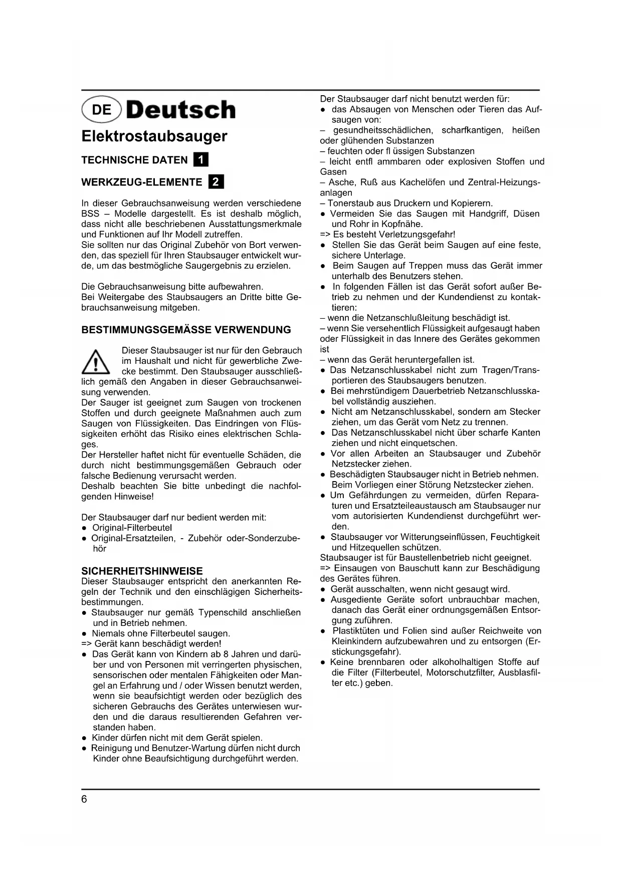 Dieser Staubsauger ist nur für den Gebrauch im Haushalt und nicht für gewerbliche Zwe- cke bestimmt. Den Staubsauger ausschließ- lich gemäß den Angaben in dieser Gebrauchsanwei- sung verwenden. Der Sauger ist geeignet zum Saugen von trockenen Stoffen und durch geeignete Maßnahmen auch zum Saugen von Flüssigkeiten. Das Eindringen von Flüs- sigkeiten erhöht das Risiko eines elektrischen Schla- ges. Der Hersteller haftet nicht für eventuelle Schäden, die durch nicht bestimmungsgemäßen Gebrauch oder falsche Bedienung verursacht werden. Deshalb beachten Sie bitte unbedingt die nachfol- genden Hinweise! Der Staubsauger darf nur bedient werden mit: ● Original-Filterbeutel ● Original-Ersatzteilen, - Zubehör oder-Sonderzube- hör SICHERHEITSHINWEISE Dieser Staubsauger entspricht den anerkannten Re- geln der Technik und den einschlägigen Sicherheits- bestimmungen. ● Staubsauger nur gemäß Typenschild anschließen und in Betrieb nehmen. ● Niemals ohne Filterbeutel saugen. => Gerät kann beschädigt werden! ● Das Gerät kann von Kindern ab 8 Jahren und darü- ber und von Personen mit verringerten physischen, sensorischen oder mentalen Fähigkeiten oder Man- gel an Erfahrung und / oder Wissen benutzt werden, wenn sie beaufsichtigt werden oder bezüglich des sicheren Gebrauchs des Gerätes unterwiesen wur- den und die daraus resultierenden Gefahren ver- standen haben. ● Kinder dürfen nicht mit dem Gerät spielen. ● Reinigung und Benutzer-Wartung dürfen nicht durch Kinder ohne Beaufsichtigung durchgeführt werden. Der Staubsauger darf nicht benutzt werden für: ● das Absaugen von Menschen oder Tieren das Auf- saugen von: – gesundheitsschädlichen, scharfkantigen, heißen oder glühenden Substanzen – feuchten oder fl üssigen Substanzen – leicht entfl ammbaren oder explosiven Stoffen und Gasen – Asche, Ruß aus Kachelöfen und Zentral-Heizungs- anlagen – Tonerstaub aus Druckern und Kopierern. ● Vermeiden Sie das Saugen mit Handgriff, Düsen und Rohr in Kopfnähe. => Es besteht Verletzungsgefahr! ● Stellen Sie das Gerät beim Saugen auf eine feste, sichere Unterlage. ● Beim Saugen auf Treppen muss das Gerät immer unterhalb des Benutzers stehen. ● In folgenden Fällen ist das Gerät sofort außer Be- trieb zu nehmen und der Kundendienst zu kontak- tieren: – wenn die Netzanschlußleitung beschädigt ist. – wenn Sie versehentlich Flüssigkeit aufgesaugt haben oder Flüssigkeit in das Innere des Gerätes gekommen ist – wenn das Gerät heruntergefallen ist. ● Das Netzanschlusskabel nicht zum Tragen/Trans- portieren des Staubsaugers benutzen. ● Bei mehrstündigem Dauerbetrieb Netzanschlusska- bel vollständig ausziehen. ● Nicht am Netzanschlusskabel, sondern am Stecker ziehen, um das Gerät vom Netz zu trennen. ● Das Netzanschlusskabel nicht über scharfe Kanten ziehen und nicht einquetschen. ● Vor allen Arbeiten an Staubsauger und Zubehör Netzstecker ziehen. ● Beschädigten Staubsauger nicht in Betrieb nehmen. Beim Vorliegen einer Störung Netzstecker ziehen. ● Um Gefährdungen zu vermeiden, dürfen Repara- turen und Ersatzteileaustausch am Staubsauger nur vom autorisierten Kundendienst durchgeführt wer- den. ● Staubsauger vor Witterungseinfl üssen, Feuchtigkeit und Hitzequellen schützen. Staubsauger ist für Baustellenbetrieb nicht geeignet. => Einsaugen von Bauschutt kann zur Beschädigung des Gerätes führen. ● Gerät ausschalten, wenn nicht gesaugt wird. ● Ausgediente Geräte sofort unbrauchbar machen, danach das Gerät einer ordnungsgemäßen Entsor- gung zuführen. ● Plastiktüten und Folien sind außer Reichweite von Kleinkindern aufzubewahren und zu entsorgen (Er- stickungsgefahr). ● Keine brennbaren oder alkoholhaltigen Stoffe auf die Filter (Filterbeutel, Motorschutzfi lter, Ausblasfi l- ter etc.) geben. DE7 Electric vacuum cleaner TECHNICAL SPECIFICATIONS 1 PRODUCT ELEMENTS 2 This instruction manual describes various BSS mod- els, which means that some of the equipment features and functions described may not be available on your model. You should only use original Bort accessories, which have been specially developed for your vacuum clean- er to achieve the best possible vacuuming results. Please keep this instruction manual in a safe place. If you pass the vacuum cleaner on to someone else, please also pass on this instruction manual. INTENDED USE This vacuum cleaner is intended for domestic use only, not for commercial use. Only use this vacuum cleaner in accordance with the instructions in this instruction manual. The vacuum cleaner is suitable for vacuuming dry ma- terials and, by taking suitable measures, also for vacu- uming liquids. The penetration of liquids increases the risk of an electric shock. The manufacturer will not accept any responsibility for damage caused by improper use or incorrect opera- tion. Therefore, you must note the following points. The vacuum cleaner must only be operated with: ● Manufacturer's original dust bags ● Manufacturer's original replacement parts, accesso- ries or special accessories SAFETY INFORMATION This vacuum cleaner complies with the generally ac- cepted standards of technology and relevant safety regulations. ● Always observe the information on the rating plate when using the vacuum cleaner and connecting to the power supply. ● Never use the vacuum cleaner without a dust bag fi tted. => This can damage the appliance. ● The appliance may be used by children over the age of 8 years and by persons with reduced phy-sical, sensory or mental capacity or by persons with a lack of experience or knowledge if they are supervised or have been instructed on the safe use of the ap- pliance and the have under-stood the potential dan- gers of using the appli-ance. ● Children must never play with the appliance ● Cleaning and user maintenance must never be car- ried out by children without supervision.