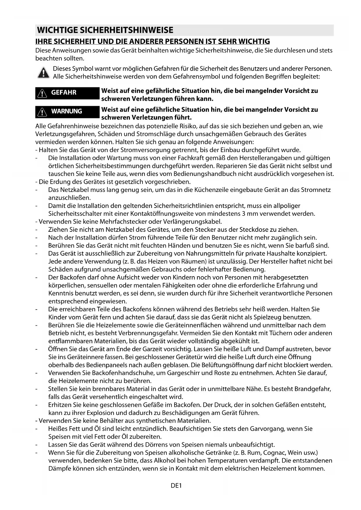 PCCO 802261 Benutzer- und Wartungshandbuch User and maintenance manual Manuel d’utilisation et d’entretien Handleiding voor gebruik en onderhoudDE1 IHRE SICHERHEIT UND DIE ANDERER PERSONEN IST SEHR WICHTIG Diese Anweisungen sowie das Gerät beinhalten wichtige Sicherheitshinweise, die Sie durchlesen und stets beachten sollten. Alle Gefahrenhinweise bezeichnen das potenzielle Risiko, auf das sie sich beziehen und geben an, wie Verletzungsgefahren, Schäden und Stromschläge durch unsachgemäßen Gebrauch des Gerätes vermieden werden können. Halten Sie sich genau an folgende Anweisungen: - Halten Sie das Gerät von der Stromversorgung getrennt, bis der Einbau durchgeführt wurde. - Die Installation oder Wartung muss von einer Fachkraft gemäß den Herstellerangaben und gültigen örtlichen Sicherheitsbestimmungen durchgeführt werden. Reparieren Sie das Gerät nicht selbst und tauschen Sie keine Teile aus, wenn dies vom Bedienungshandbuch nicht ausdrücklich vorgesehen ist. - Die Erdung des Gerätes ist gesetzlich vorgeschrieben. - Das Netzkabel muss lang genug sein, um das in die Küchenzeile eingebaute Gerät an das Stromnetz anzuschließen. - Damit die Installation den geltenden Sicherheitsrichtlinien entspricht, muss ein allpoliger Sicherheitsschalter mit einer Kontaktöffnungsweite von mindestens 3 mm verwendet werden. - Verwenden Sie keine Mehrfachstecker oder Verlängerungskabel. - Ziehen Sie nicht am Netzkabel des Gerätes, um den Stecker aus der Steckdose zu ziehen. - Nach der Installation dürfen Strom führende Teile für den Benutzer nicht mehr zugänglich sein. - Berühren Sie das Gerät nicht mit feuchten Händen und benutzen Sie es nicht, wenn Sie barfuß sind. - Das Gerät ist ausschließlich zur Zubereitung von Nahrungsmitteln für private Haushalte konzipiert. Jede andere Verwendung (z. B. das Heizen von Räumen) ist unzulässig. Der Hersteller haftet nicht bei Schäden aufgrund unsachgemäßen Gebrauchs oder fehlerhafter Bedienung. - Der Backofen darf ohne Aufsicht weder von Kindern noch von Personen mit herabgesetzten körperlichen, sensuellen oder mentalen Fähigkeiten oder ohne die erforderliche Erfahrung und Kenntnis benutzt werden, es sei denn, sie wurden durch für ihre Sicherheit verantwortliche Personen entsprechend eingewiesen. - Die erreichbaren Teile des Backofens können während des Betriebs sehr heiß werden. Halten Sie Kinder vom Gerät fern und achten Sie darauf, dass sie das Gerät nicht als Spielzeug benutzen. - Berühren Sie die Heizelemente sowie die Geräteinnenflächen während und unmittelbar nach dem Betrieb nicht, es besteht Verbrennungsgefahr. Vermeiden Sie den Kontakt mit Tüchern oder anderen entflammbaren Materialien, bis das Gerät wieder vollständig abgekühlt ist. - Öffnen Sie das Gerät am Ende der Garzeit vorsichtig. Lassen Sie heiße Luft und Dampf austreten, bevor Sie ins Geräteinnere fassen. Bei geschlossener Gerätetür wird die heiße Luft durch eine Öffnung oberhalb des Bedienpaneels nach außen geblasen. Die Belüftungsöffnung darf nicht blockiert werden. - Verwenden Sie Backofenhandschuhe, um Gargeschirr und Roste zu entnehmen. Achten Sie darauf, die Heizelemente nicht zu berühren. - Stellen Sie kein brennbares Material in das Gerät oder in unmittelbare Nähe. Es besteht Brandgefahr, falls das Gerät versehentlich eingeschaltet wird. - Erhitzen Sie keine geschlossenen Gefäße im Backofen. Der Druck, der in solchen Gefäßen entsteht, kann zu ihrer Explosion und dadurch zu Beschädigungen am Gerät führen. - Verwenden Sie keine Behälter aus synthetischen Materialien. - Heißes Fett und Öl sind leicht entzündlich. Beaufsichtigen Sie stets den Garvorgang, wenn Sie Speisen mit viel Fett oder Öl zubereiten. - Lassen Sie das Gerät während des Dörrens von Speisen niemals unbeaufsichtigt. - Wenn Sie für die Zubereitung von Speisen alkoholische Getränke (z. B. Rum, Cognac, Wein usw.) verwenden, bedenken Sie bitte, dass Alkohol bei hohen Temperaturen verdampft. Die entstandenen Dämpfe können sich entzünden, wenn sie in Kontakt mit dem elektrischen Heizelement kommen. WICHTIGE SICHERHEITSHINWEISE Dieses Symbol warnt vor möglichen Gefahren für die Sicherheit des Benutzers und anderer Personen. Alle Sicherheitshinweise werden von dem Gefahrensymbol und folgenden Begriffen begleitet: GEFAHR Weist auf eine gefährliche Situation hin, die bei mangelnder Vorsicht zu schweren Verletzungen führen kann. WARNUNG Weist auf eine gefährliche Situation hin, die bei mangelnder Vorsicht zu schweren Verletzungen führt.DE2 Entsorgung von Altgeräten - Dieses Gerät wurde aus recycelbaren oder wiederverwendbaren Werkstoffen hergestellt. Die Entsorgung muss gemäß den örtlichen Bestimmungen zur Abfallbeseitigung erfolgen. Machen Sie das Gerät vor der Verschrottung unbrauchbar, indem Sie das Netzkabel abschneiden. - Weitere Informationen zu Behandlung, Verwertung, und Wiederverwendung von Elektrogeräten können Sie bei der örtlichen Abfallbeseitigungsgesellschaft, der nächsten Sammelstelle für Haushaltsmll oder bei Ihrem Händler erfragen, bei dem das Gerät gekauft wurde. Prüfen Sie nach dem Auspacken, ob der Backofen etwaige Transportschäden aufweist und die Backofentür richtig schließt. Bei auftretenden Problemen wenden Sie sich bitte an Ihren Händler oder rufen die nächste Kundendienststelle an. Um eventuellen Schäden vorzubeugen, sollten Sie das Gerät erst unmittelbar vor der Installation von der Polystyrolunterlage nehmen.