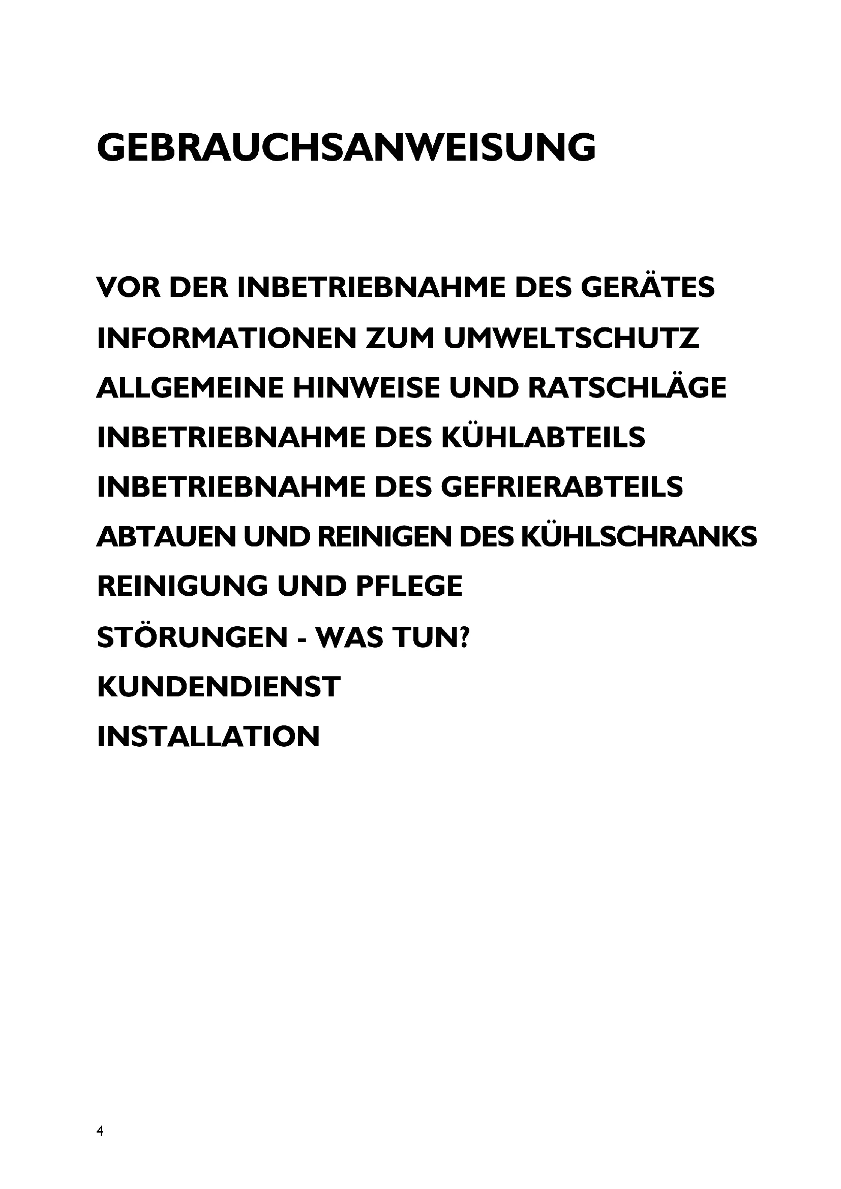 - Das von Ihnen gekaufte Gerät ist ausschließlich für den Hausgebrauch Damit Sie den größtmöglichen Nutzen aus Ihrem Gerät ziehen, lesen Sie bitte aufmerksam die Bedienungsanleitung, in der Sie die Gerätebeschreibung sowie nützliche Ratschläge zur Aufbewahrung der Lebensmittel finden. Heben Sie diese Anleitung zum Nachschlagen gut auf. 1.Nach dem Auspacken das Gerät auf Beschädigungen überprüfen und sicherstellen, dass die Türen einwandfrei schließen. Mögliche Schäden müssen dem Händler innerhalb von 24 Stunden nach Anlieferung gemeldet werden. 2.Warten Sie vor der Inbetriebnahme des Gerätes mindestens zwei Stunden, damit der Kühlkreis seine volle Funktionstüchtigkeit erreichen kann. 3.Die Installation und der elektrische Anschluss müssen von einer Fachkraft gemäß den Herstelleranweisungen und den gültigen örtlichen Bestimmungen ausgeführt werden 4.Vor der Inbetriebnahme das Innere des Gerätes reinigen. 1.Verpackung Das Verpackungsmaterial ist zu 100% wieder verwertbar und durch ein Recyclingsymbol gekennzeichnet. Für die Entsorgung die örtlichen Vorschriften beachten. Das Verpackungsmaterial (Plastikbeutel, Styroporteile, usw.) außerhalb der Reichweite von Kindern aufbewahren, da es eine mögliche Gefahrenquelle darstellt. 2.Entsorgung Das Gerät wurde aus wieder verwertbaren Materialien hergestellt. In Übereinstimmung mit den Anforderungen der Europäischen Richtlinie 2002/96/EG über Elektro- und Elektronik- Altgeräte (WEEE) ist vorliegendes Gerät mit einer Markierung versehen. Sie leisten einen positiven Beitrag für den Schutz der Umwelt und die Gesundheit des Menschen, wenn Sie dieses Gerät einer gesonderten Abfallsammlung zuführen. Im unsortierten Siedlungsmüll könnte ein solches Gerät durch unsachgemäße Entsorgung negative Konsequenzen nach sich ziehen. Auf dem Produkt oder der beiliegenden Produktdokumentation ist folgendes Symbol einer durchgestrichenen Abfalltonne abgebildet. Es weist darauf hin, dass eine Entsorgung im normalen Haushaltsabfall nicht zulässig ist Entsorgen Sie dieses Produkt im Recyclinghof mit einer getrennten Sammlung für Elektro- und Elektronikgeräte. Vor der Beseitigung des Gerätes das Speisekabel durchtrennen, Türen und Ablageflächen entfernen, damit das Gerät funktionsuntüchtig ist und keine Gefahrenquelle für spielende Kinder darstellen kann. Bei der Entsorgung die örtlichen Bestimmungen zur Abfallbeseitigung beachten und das Gerät bei den zugelassenen Entsorgungsbetrieben abliefern; das Gerät auf keinen Fall, auch nicht für wenige Tage, unbewacht stehen lassen, da es eine Gefahrenquelle für spielende Kinder darstellen kann. Bitte wenden Sie sich an die zuständigen Behörden Ihrer Gemeindeverwaltung, an den lokalen Recyclinghof für Haushaltsmüll oder an den Händler, bei dem Sie dieses Gerät erworben haben, um weitere Informationen über Behandlung, Verwertung und Wiederverwendung dieses Produkts zu erhalten. Information: Dieses Gerät ist FCKW-frei (der Kältekreislauf enthält R 134 a) oder FKW-frei (der Kältekreislauf enthält R 600a). Für Geräte mit Isobutan (R600a): Isobutan ist ein Naturgas ohne umweltschädigende Auswirkungen, es ist jedoch entflammbar. Die Leitungen des Kältekreises müssen daher unbedingt auf ihre Unversehrtheit überprüft werden. Konformitätserklärung