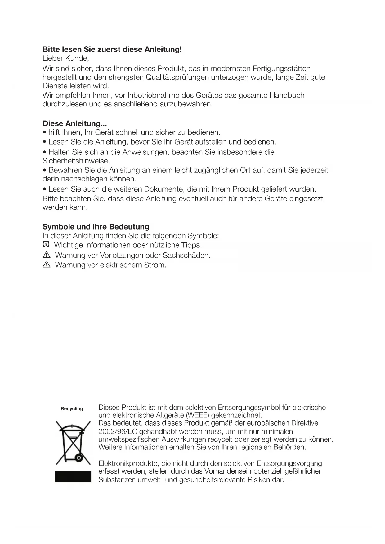 - Lesen Sie auch die weiteren Dokumente, die mit Ihrem Produkt geliefert wurden. Bitte beachten Sie, dass diese Anleitung eventuell auch für andere Geräte eingesetzt werden kann. Symbole und ihre Bedeutung In dieser Anleitung finden Sie die folgenden Symbole: C Wichtige Informationen oder nützliche Tipps. A Warnung vor Verletzungen oder Sachschäden. B Warnung vor elektrischem Strom. Dieses Produkt ist mit dem selektiven Entsorgungssymbol für elektrische und elektronische Altgeräte (WEEE) gekennzeichnet. Das bedeutet, dass dieses Produkt gemäß der europäischen Direktive 2002/96/EC gehandhabt werden muss, um mit nur minimalen umweltspezifischen Auswirkungen recycelt oder zerlegt werden zu können. Weitere Informationen erhalten Sie von Ihren regionalen Behörden. Elektronikprodukte, die nicht durch den selektiven Entsorgungsvorgang erfasst werden, stellen durch das Vorhandensein potenziell gefährlicher Substanzen umwelt- und gesundheitsrelevante Risiken dar. RecyclingDE