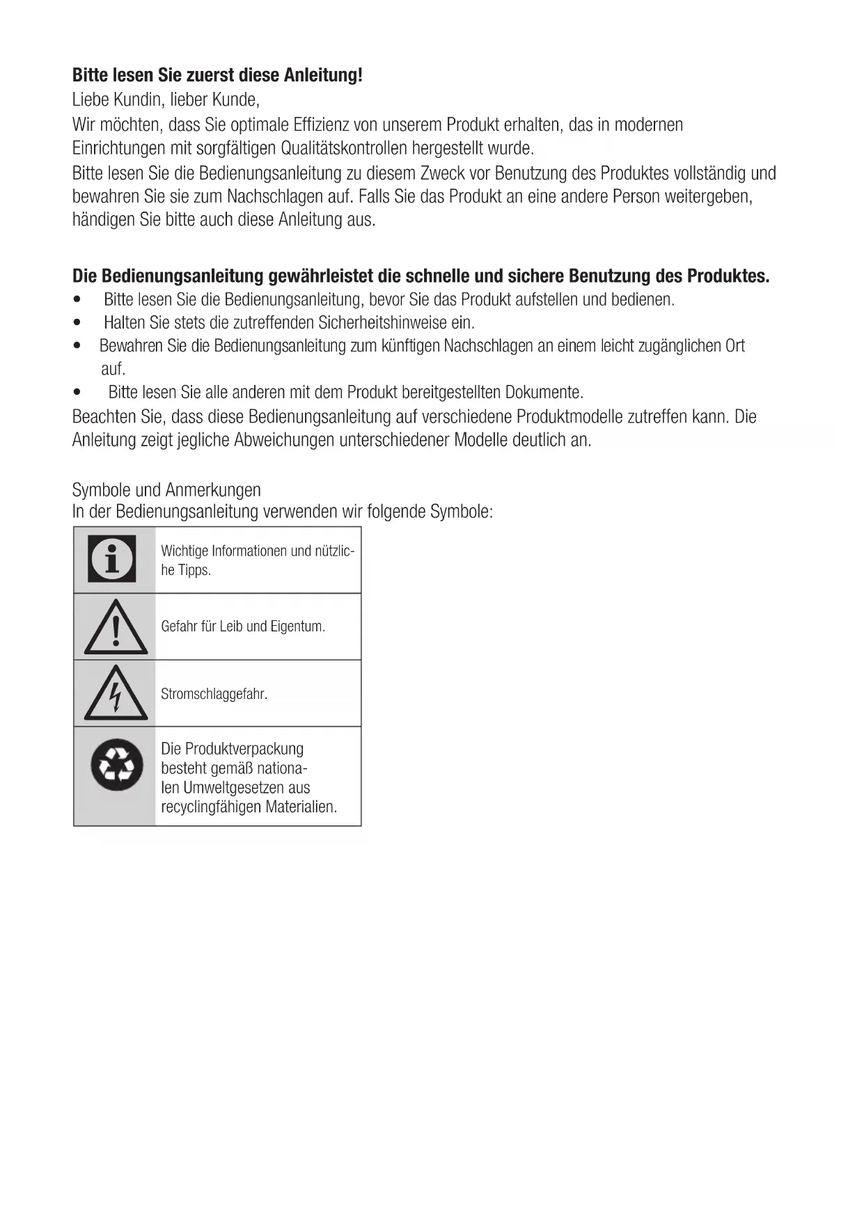 - Bitte lesen Sie die Bedienungsanleitung, bevor Sie das Produkt aufstellen und bedienen.