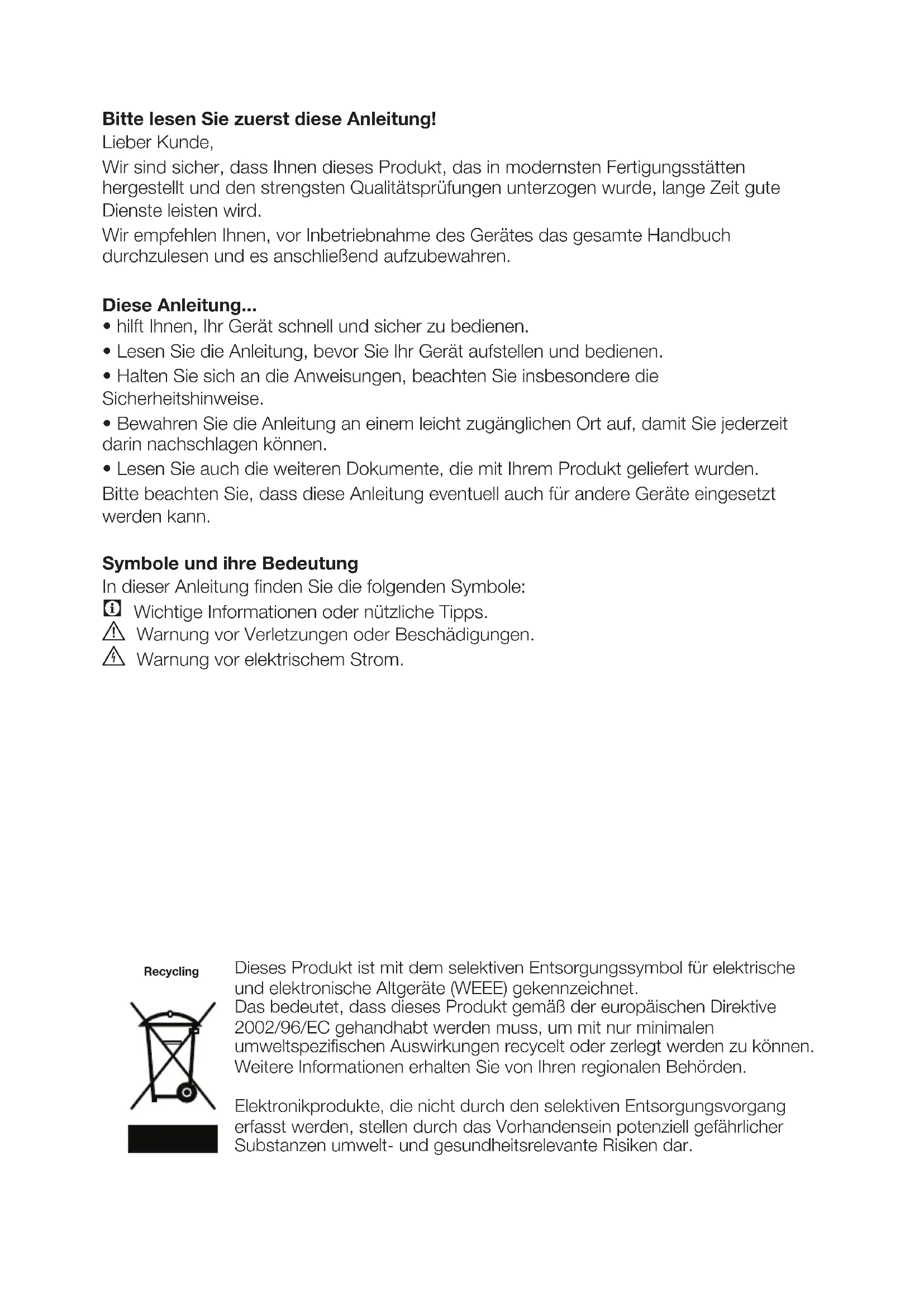 - Lesen Sie auch die weiteren Dokumente, die mit Ihrem Produkt geliefert wurden. Bitte beachten Sie, dass diese Anleitung eventuell auch für andere Geräte eingesetzt werden kann. Symbole und ihre Bedeutung In dieser Anleitung finden Sie die folgenden Symbole: C Wichtige Informationen oder nützliche Tipps. A Warnung vor Verletzungen oder Beschädigungen. B Warnung vor elektrischem Strom. Dieses Produkt ist mit dem selektiven Entsorgungssymbol für elektrische und elektronische Altgeräte (WEEE) gekennzeichnet. Das bedeutet, dass dieses Produkt gemäß der europäischen Direktive 2002/96/EC gehandhabt werden muss, um mit nur minimalen umweltspezifischen Auswirkungen recycelt oder zerlegt werden zu können. Weitere Informationen erhalten Sie von Ihren regionalen Behörden. Elektronikprodukte, die nicht durch den selektiven Entsorgungsvorgang erfasst werden, stellen durch das Vorhandensein potenziell gefährlicher Substanzen umwelt- und gesundheitsrelevante Risiken dar. RecyclingDE