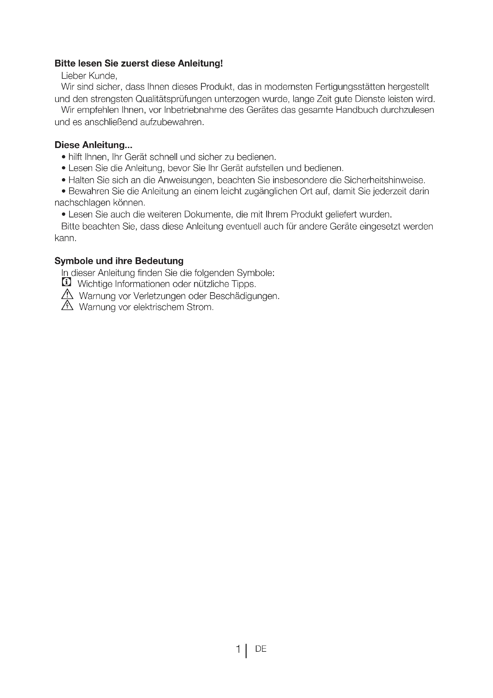 - Lesen Sie auch die weiteren Dokumente, die mit Ihrem Produkt geliefert wurden. Bitte beachten Sie, dass diese Anleitung eventuell auch für andere Geräte eingesetzt werden kann. Symbole und ihre Bedeutung In dieser Anleitung finden Sie die folgenden Symbole: C Wichtige Informationen oder nützliche Tipps. A Warnung vor Verletzungen oder Beschädigungen. B Warnung vor elektrischem Strom.DE