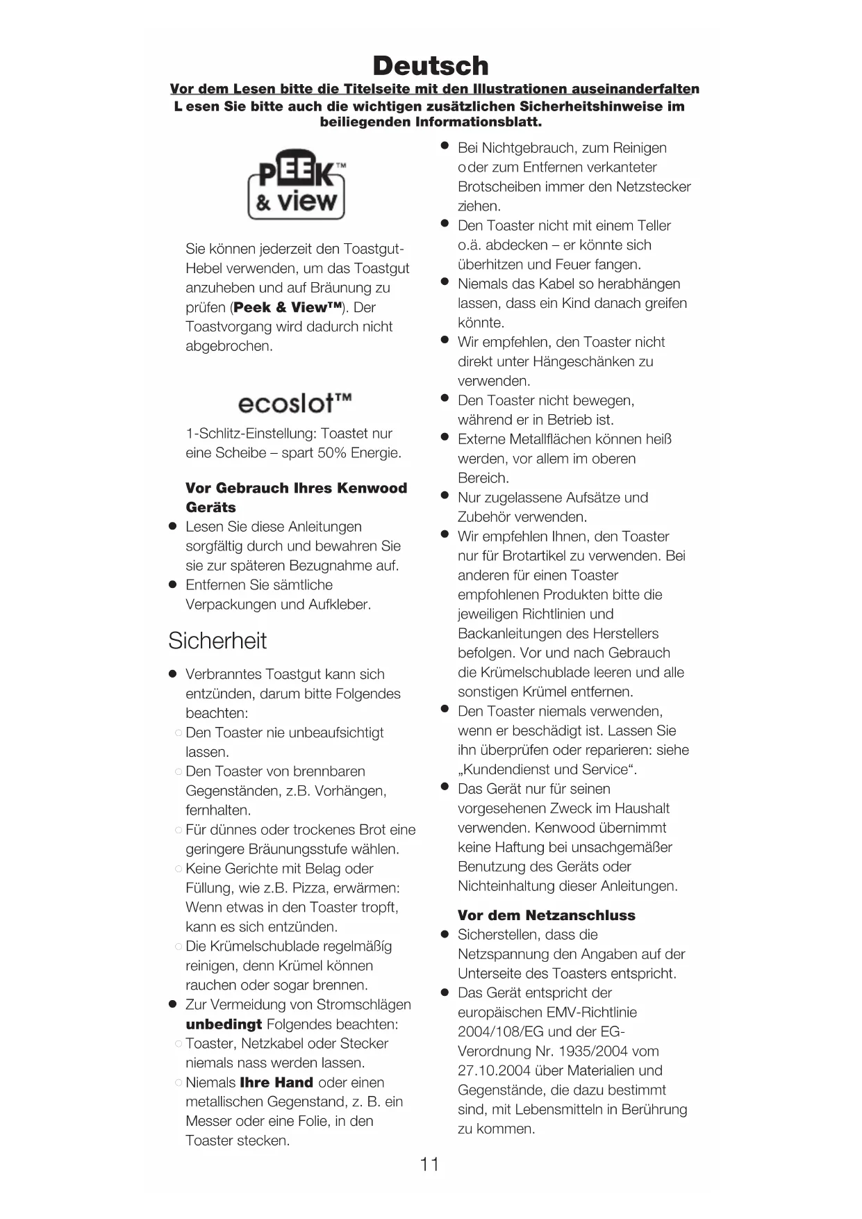 EG-RICHTLINIE 2002/96/EG Am Ende seiner Nutzungszeit darf das Produkt NICHT mit dem Hausmüll entsorgt werden. Es muss zu einer örtlichen Sammelstelle für Sondermüll oder zu einem Fachhändler gebracht werden, der einen Rücknahmeservice anbietet. Die getrennte Entsorgung eines Haushaltsgeräts vermeidet mögliche negative Auswirkungen auf die Umwelt und die menschliche Gesundheit, die durch eine nicht vorschriftsmäßige Entsorgung bedingt sind. Zudem ermöglicht dies die Wiederverwertung der Materialien, aus denen das Gerät hergestellt wurde, was erhebliche Einsparungen an Energie und Rohstoffen mit sich bringt. Zur Erinnerung an die korrekte getrennte Entsorgung von Haushaltsgeräten ist das Gerät mit dem Symbol einer durchgestrichenen Mülltonne gekennzeichnet. 13U sare la leva Peek & View™ per sollevare il pane e verificarne il livello di doratura, senza cancellare il ciclo. L’impostazione a 1 Scomparto vi fa risparmiare il 50% di energia, riscaldando solo quello che desiderate. prima di utilizzare la vostra apparecchiatura Kenwood