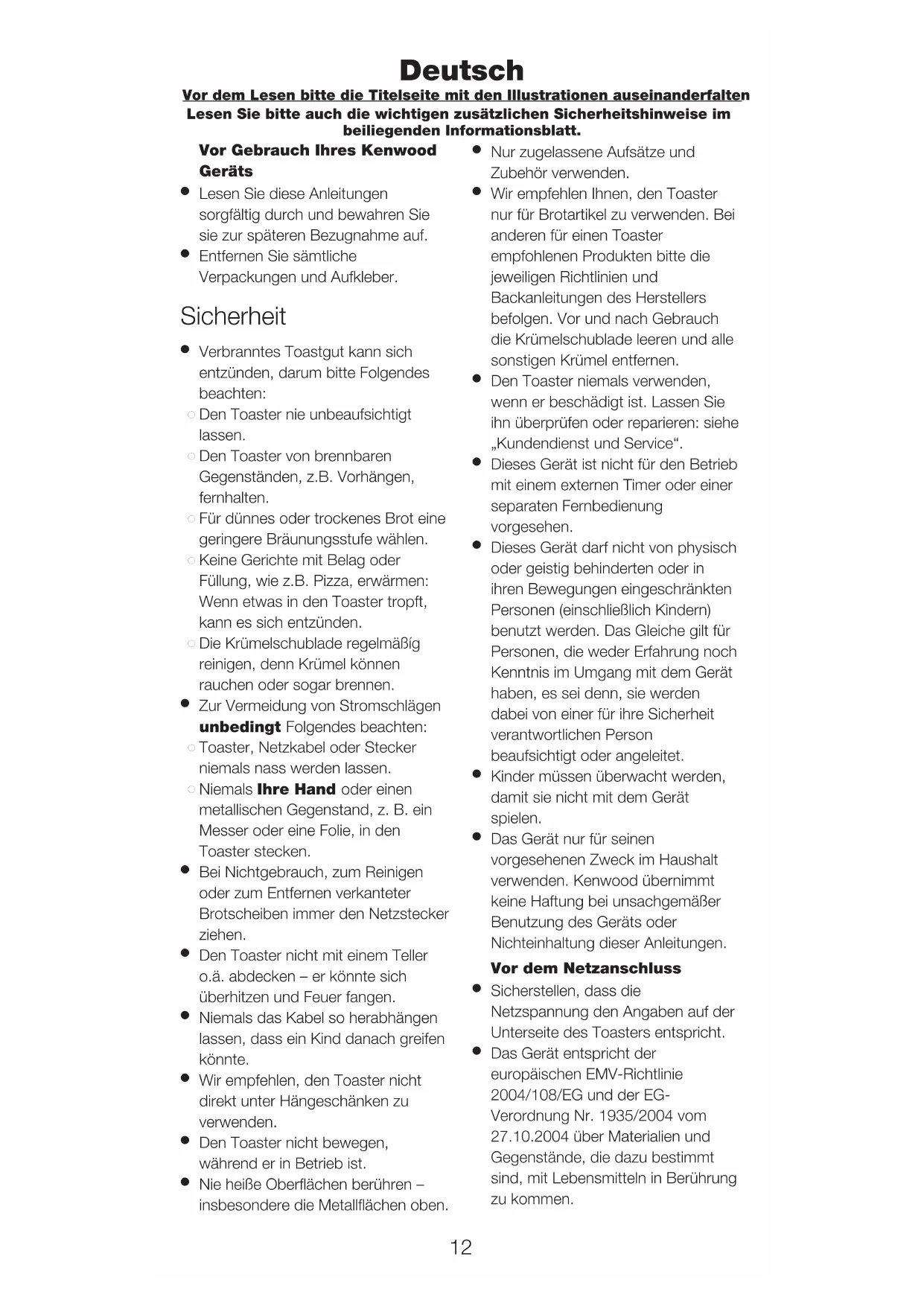 Das Gerät nur für seinen vorgesehenen Zweck im Haushalt verwenden. Kenwood übernimmt keine Haftung bei unsachgemäßer Benutzung des Geräts oder Nichteinhaltung dieser Anleitungen. Vor dem Netzanschluss