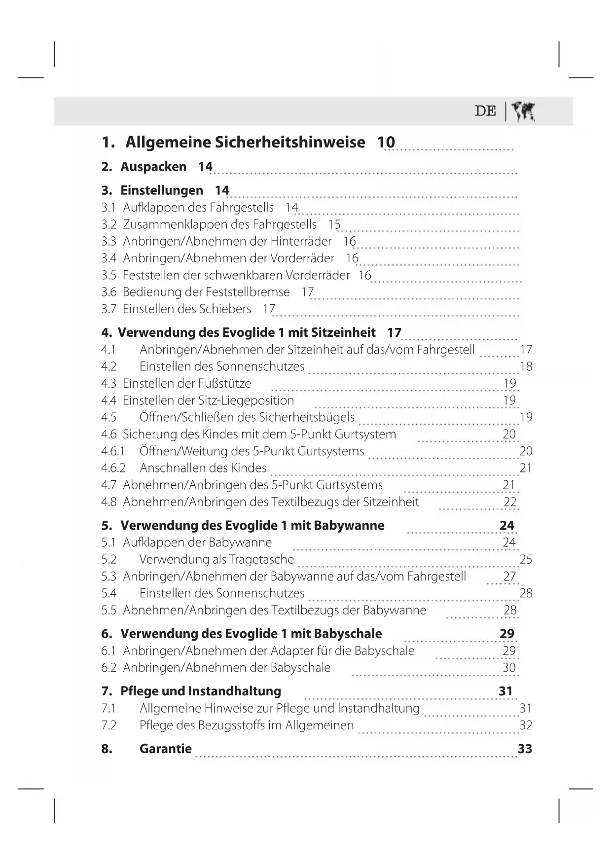 Lesen Sie vor Benutzung des Kinderwagens diese Gebrauchsanleitung aufmerk- sam durch und bewahren Sie sie sorgfältig auf. Nichtbeachtung dieser Anleitung kann Ihr Kind gefährden.DE