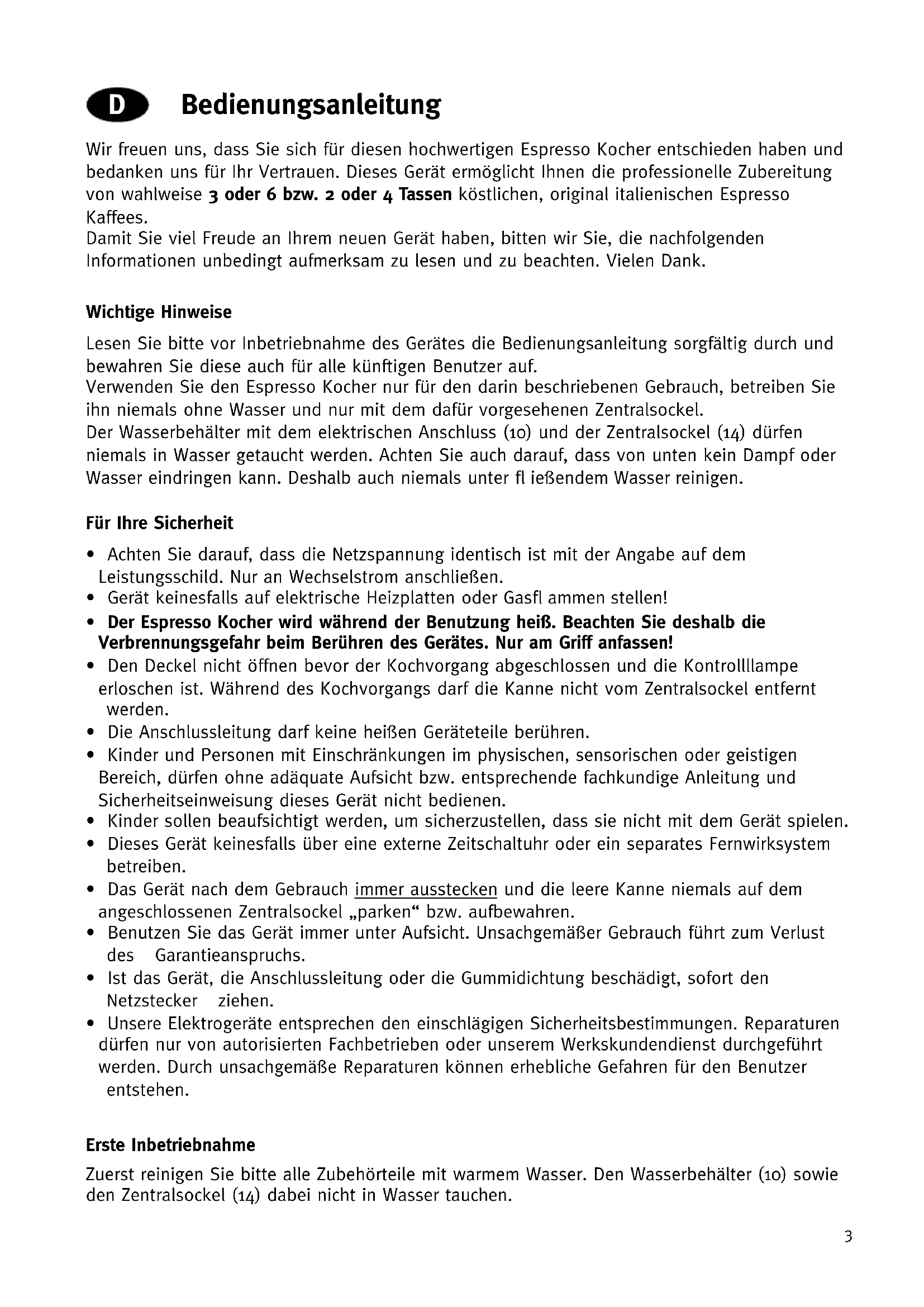 D Bedienungsanleitung Wir freuen uns, dass Sie sich für diesen hochwertigen Espresso Kocher entschieden haben und bedanken uns für Ihr Vertrauen. Dieses Gerät ermöglicht Ihnen die professionelle Zubereitung von wahlweise 3 oder 6 bzw. 2 oder 4 Tassen köstlichen, original italienischen Espresso Kaffees. Damit Sie viel Freude an Ihrem neuen Gerät haben, bitten wir Sie, die nachfolgenden Informationen unbedingt aufmerksam zu lesen und zu beachten. Vielen Dank. Wichtige Hinweise Lesen Sie bitte vor Inbetriebnahme des Gerätes die Bedienungsanleitung sorgfältig durch und bewahren Sie diese auch für alle künftigen Benutzer auf. Verwenden Sie den Espresso Kocher nur für den darin beschriebenen Gebrauch, betreiben Sie ihn niemals ohne Wasser und nur mit dem dafür vorgesehenen Zentralsockel. Der Wasserbehälter mit dem elektrischen Anschluss (10) und der Zentralsockel (14) dürfen niemals in Wasser getaucht werden. Achten Sie auch darauf, dass von unten kein Dampf oder Wasser eindringen kann. Deshalb auch niemals unter fl ießendem Wasser reinigen. Für Ihre Sicherheit