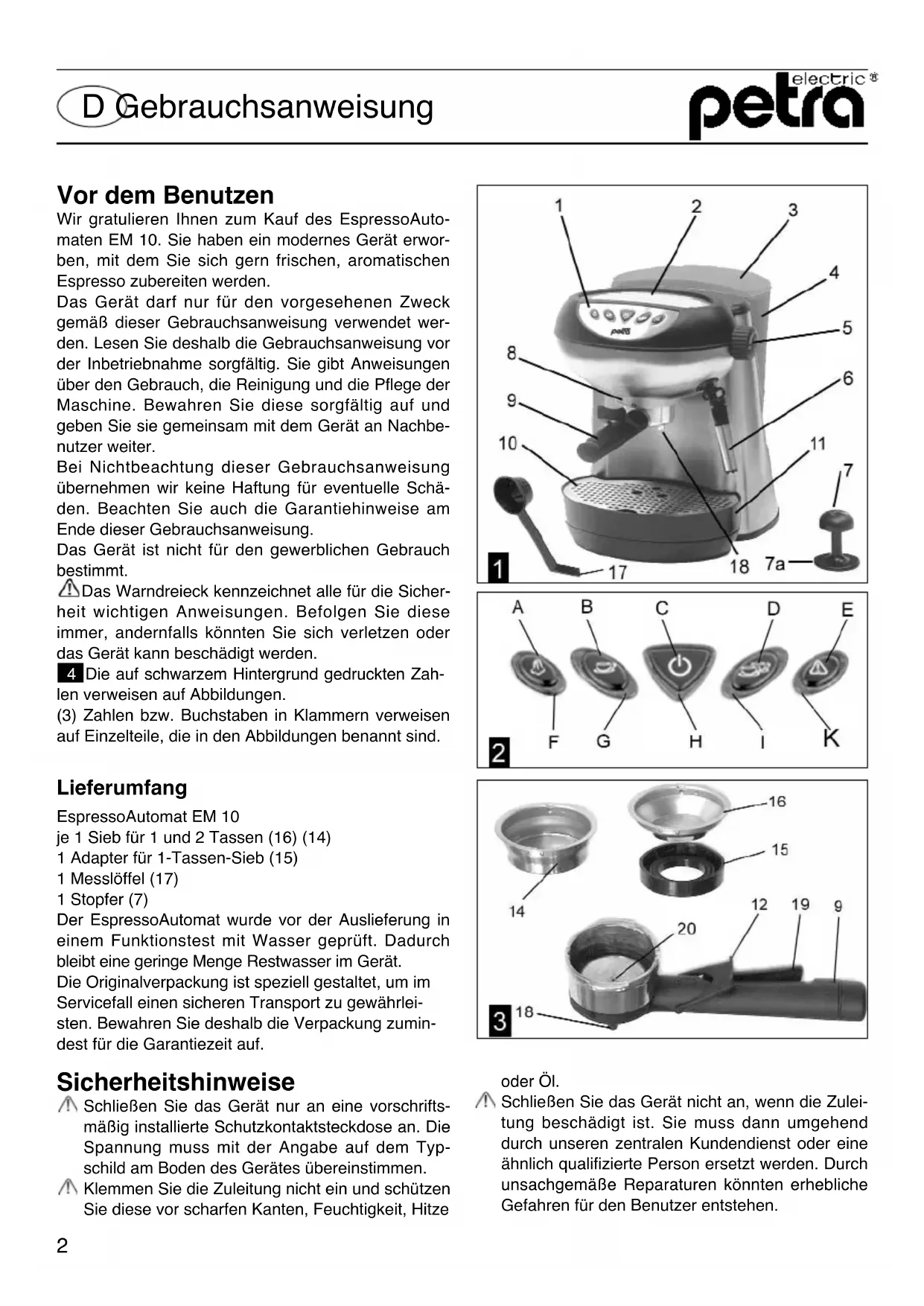 EspressoAutomat EM 10 - Kaffeemaschine Petra Electric - Kostenlose Bedienungsanleitung